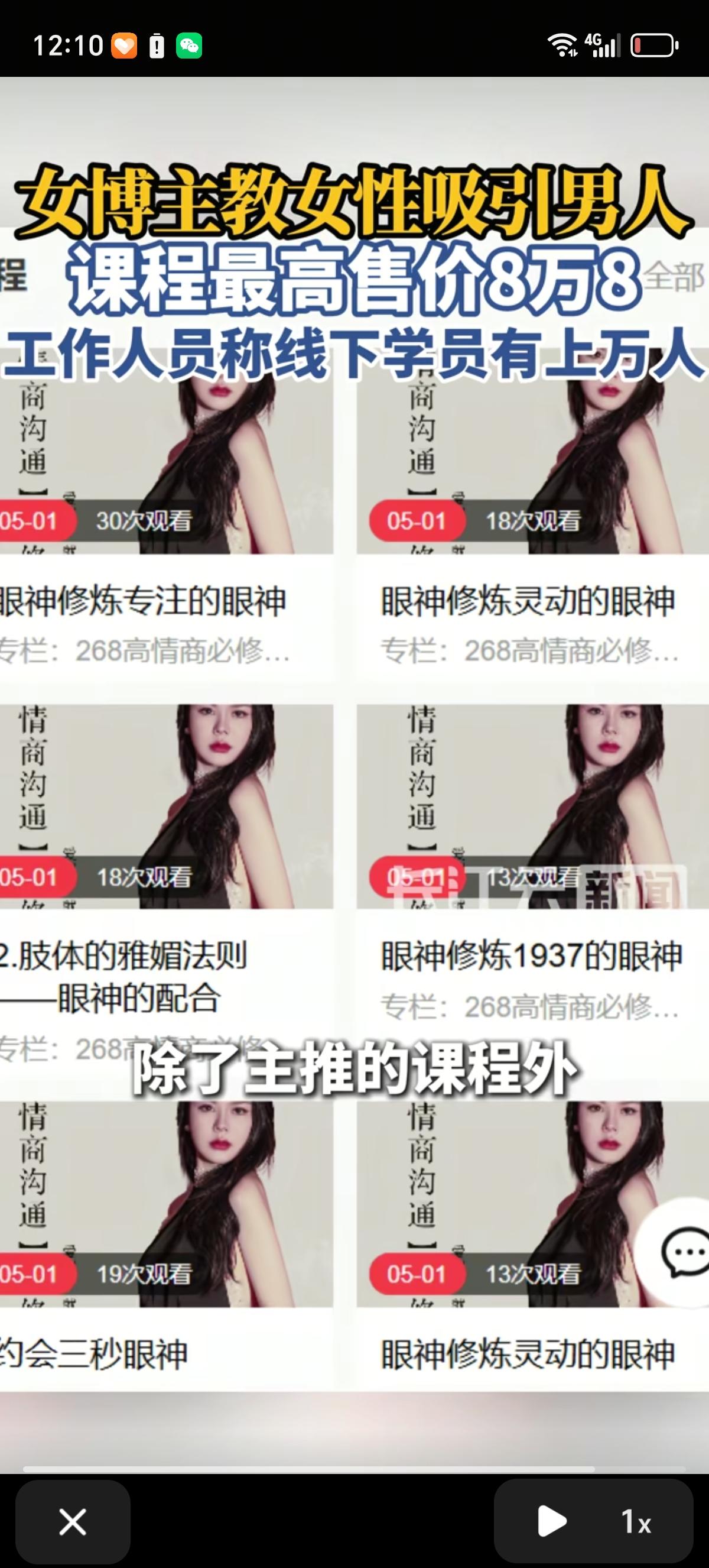 女人的钱真是好赚啊,还有女博主专门教女人怎么吸引男人,如眼睛怎么勾魂,怎么撒娇,号称“性商第一人”,她的课程最高8万8。 课程包含情感、魅力、疗愈,课程三天三夜,《性敢启示录》、《三好女人.名器锻造营》、《驯兽师》、《情感研习班》等等,费用4980。 外场费用2999元,课程两天两夜,只有驯兽师一个板块,包括怎么让婚姻保持激情,恋爱婚姻技巧的学习等,没有一天的疗愈课程。 线下“性商学苑”课程预约火爆,每月十多场,报名得提前十天,学员规模十几万,地点主要在长沙,部分课程也会在杭州、广州、厦门,已经开设了好几年。 除了主推的2999两天两夜训练营和4980三天三夜训练营课程外,还有999的线上课程,以及49800元和8800元的导师课程。