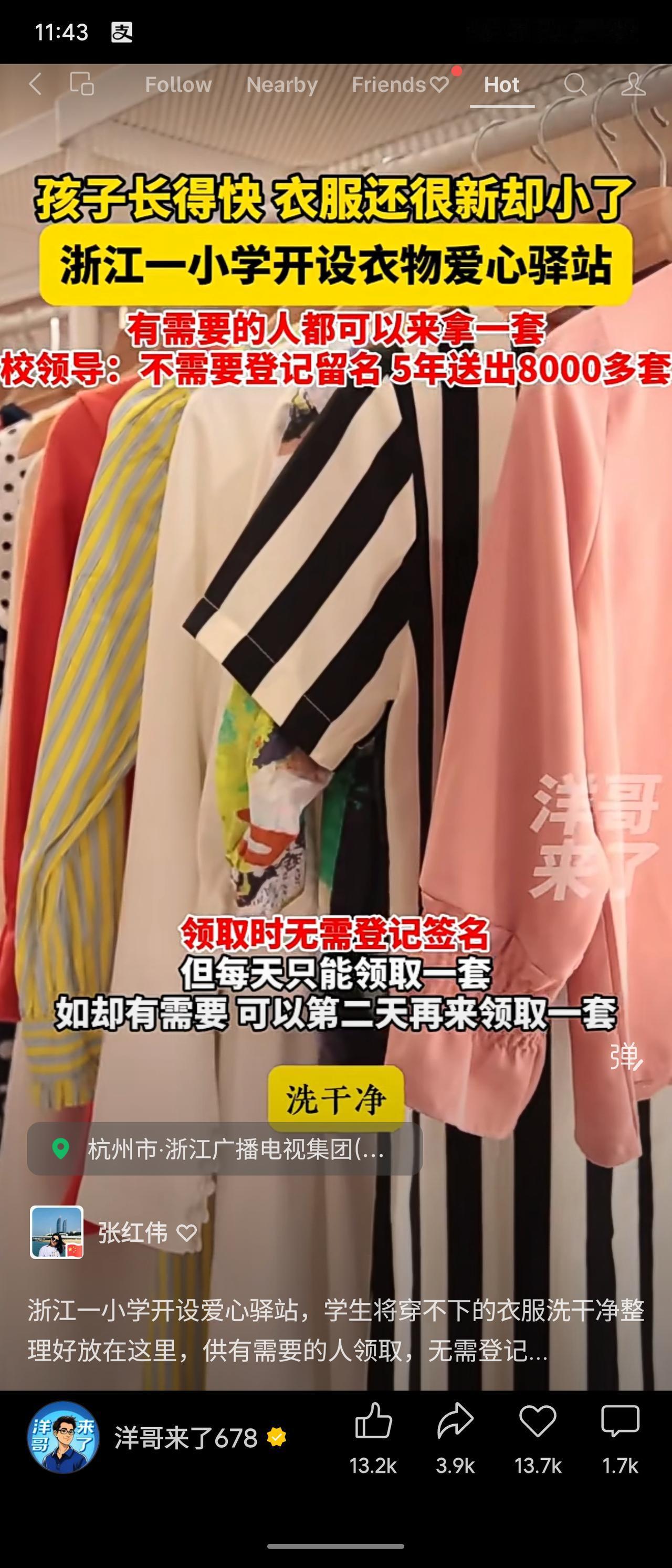 浙江台州路桥小学开设衣物爱心驿站,学生将穿不下的洗净衣物放入驿站,供需要者自由领取,无需登记。五年来已送出超8000套衣物,传递温暖与节约理念。