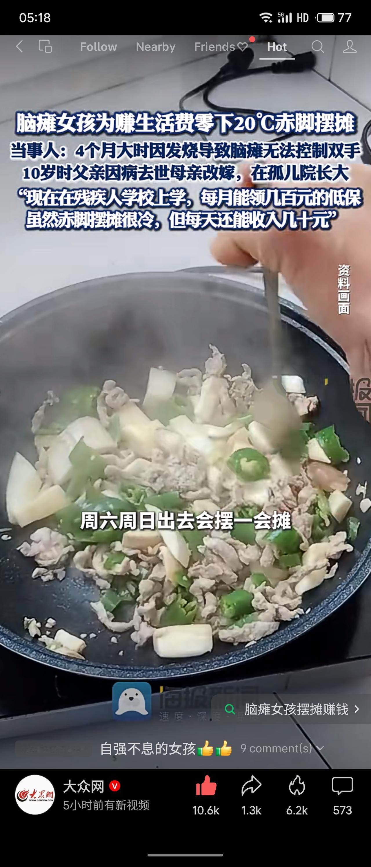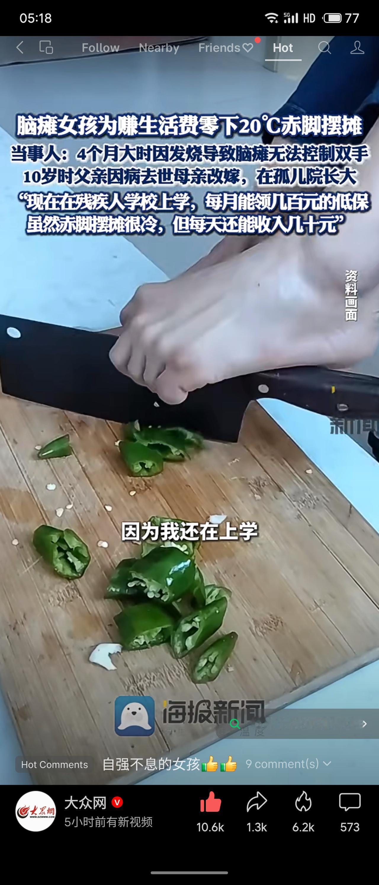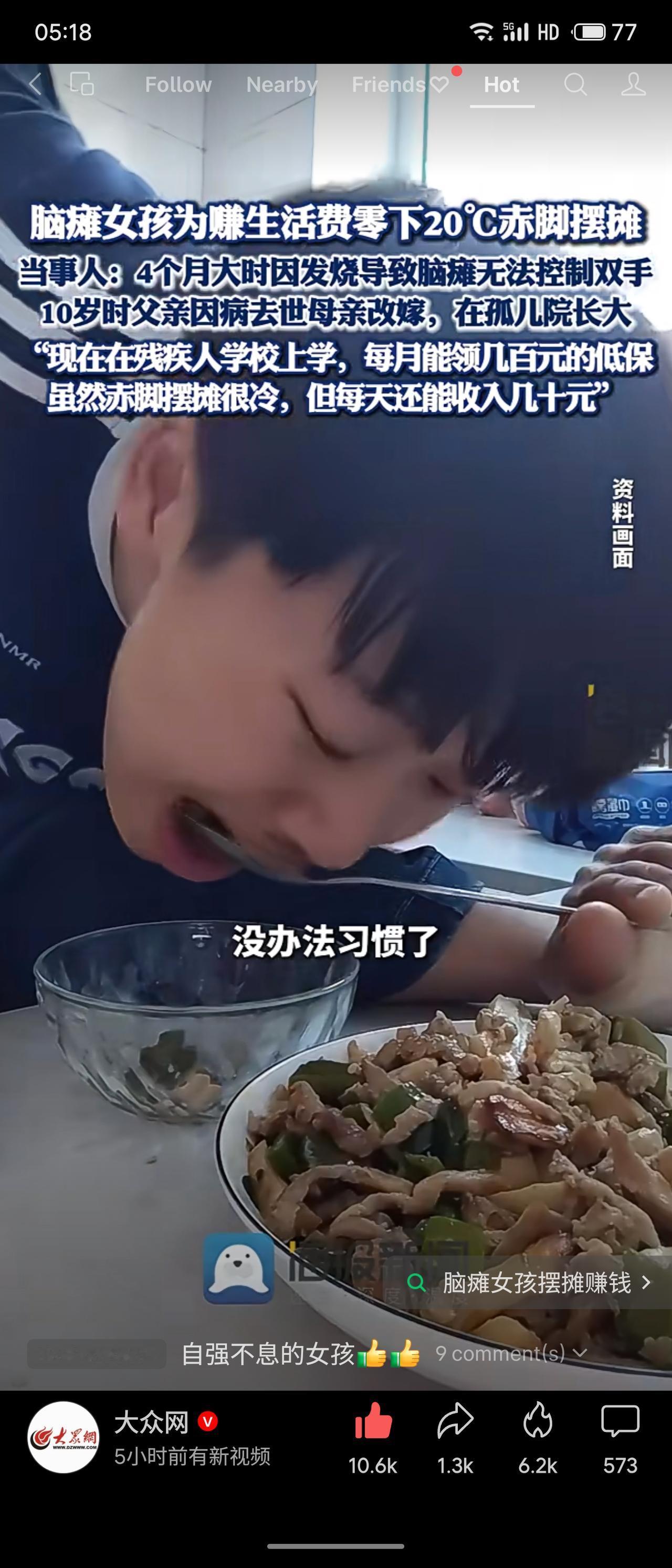 吉林延边一脑瘫女孩在零下20℃严寒中赤脚摆摊赚取生活费。她幼时因发烧致脑瘫,无法控制双手,父亲早逝、母亲改嫁,在孤儿院长大。现就读残疾人学校,虽有低保,仍利用周末摆摊,日收入几十元,以双脚自理生活,坚韧自强。
