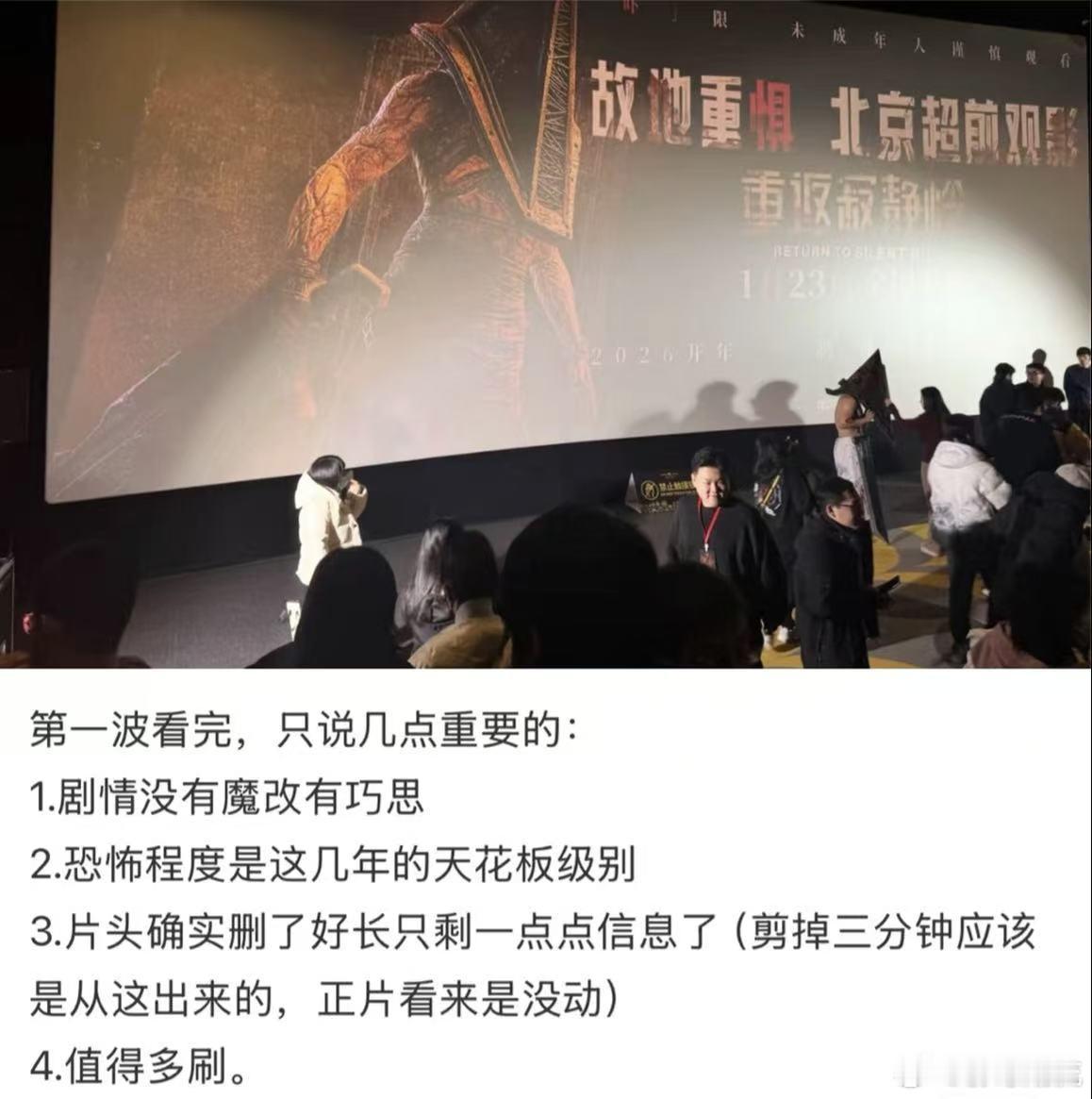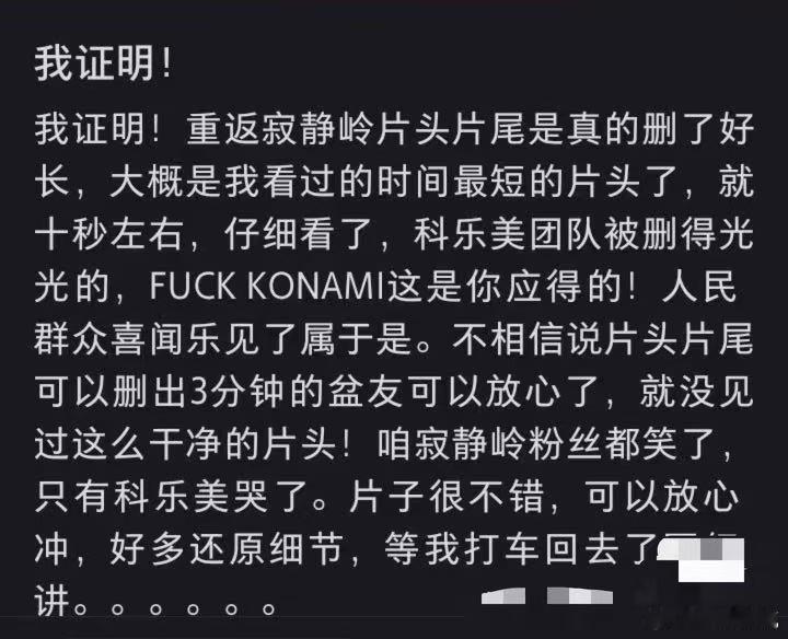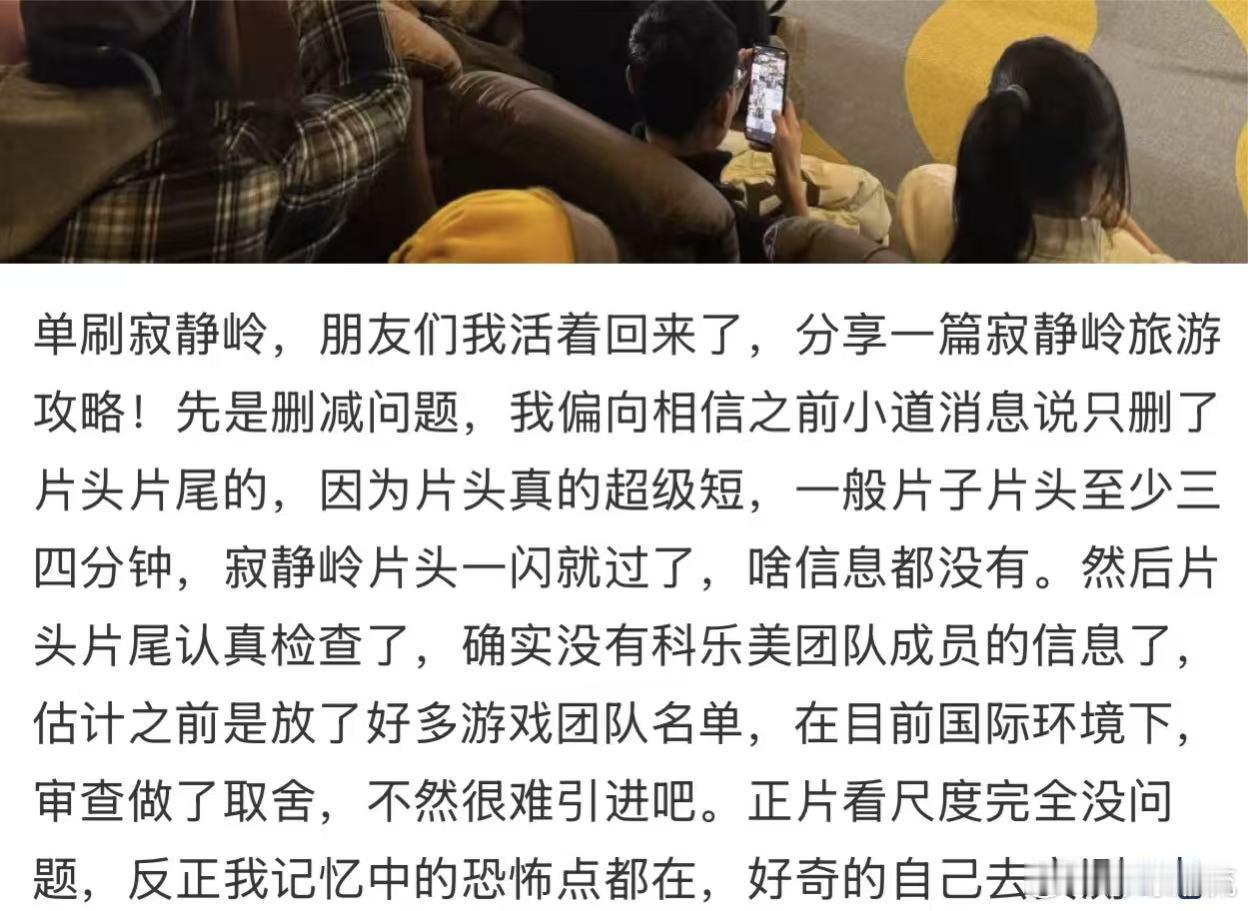 重返寂静岭中外网友对比片头时长 本来还担心重返寂静岭内地版删减正片,结果看中外网友对比,就只是片头剪了团队信息,时长比海外版短,正片的恐怖镜头都保住了,这波真的太惊喜了。