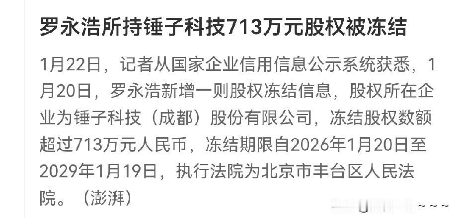 啥情况?刚刚看到,罗永浩所持锤子科技713万元股权被冻结?难道罗永浩还欠银行里的钱还是怎么回事啊?这锤子科技都多久的事了怎么还活着?锤子科技是研究什么东西的?生产什么玩意的?是以前听说到过的那个子弹短信吗? 话说回来,这713万元对罗永浩来说也是小菜一碟,搞个几场直播不就来了吗?现在流量这么大。百思不得其解。