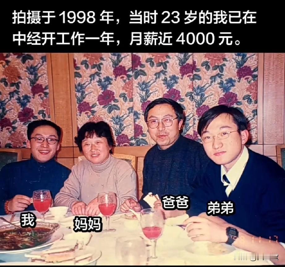 照片拍摄于1998年。 当时23岁的我已经在中经开工作一年,月薪近4000元。 有人注意他的工作单位吗? 有网友说,中经开曾经是多么牛逼的一个公司,327国债期货事件的大赢家。 也太牛了吧,1998年月薪4000元,现在多少人的月薪都没达到4000元呢。 求解答:照片中的爹,是啥职位?