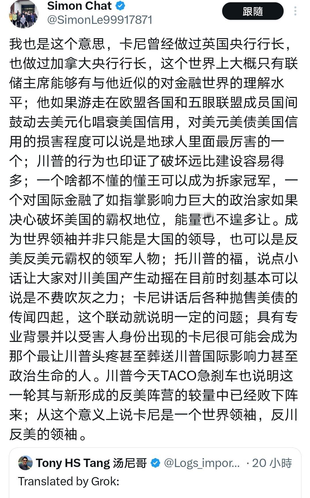Simon这个观点,让我想到一个“破壁人”的概念 没有错!卡尼,才是特朗普霸权的终极破壁人 特朗普从来不是破局者,只是个搅局拆家的 “懂王”;而真正能击穿美国霸权壁垒、让其头疼的终极破壁人,唯有卡尼 —— 这个手握西方金融顶级话语权,又站在美霸受害方的硬核角色。 他的杀伤力,地球人里独一份:英、加两国央行行长出身,联储主席之外,无人比他更洞悉美元美债的底层逻辑。他从非外行喊反美,而是圈内人精准揭短,从金融根子里拆解美国信用,专业度让他一言既出,美债抛售传闻便应声而起。 身为西方核心圈层精英,更是美国关税霸凌、格陵兰扩张的直接受害者,这份双重身份,让他的反霸从不是意识形态对抗,而是西方阵营内部的正当维权。不贴标签,不喊空号,却能一呼百应,游走于欧盟与五眼联盟之间,轻松将欧洲、加拿大、北欧波罗的海八国拧成反美阵营。 特朗普用鲁莽撕开美欧同盟裂痕,透支美国全球信用,亲手把美国的牌打烂;而卡尼呢,只需借势推波,便能让世界对美国的信任摇摇欲坠 —— 托懂王的福,动摇美国根基,对他而言本就不费吹灰之力。 破坏远比建设容易,一个啥都不懂的懂王能肆意拆家,一个精通国际金融的政治家决心反霸,能量只会更甚。他不是传统大国领袖,却凭专业、身份与时代契机,成为反美反美元霸权的领军人物;从未与特朗普正面交锋,却让其霸权操作,成了所有美国盟友的共同对手。 特朗普的 TACO 急刹车,早已昭示这轮较量的结局:他面对的从不是一个丹麦,而是卡尼操盘的、撬动了全球资本的反霸阵营。这个男人,才是最可能葬送特朗普国际影响力,甚至政治生命的终极破壁人。 Source: X