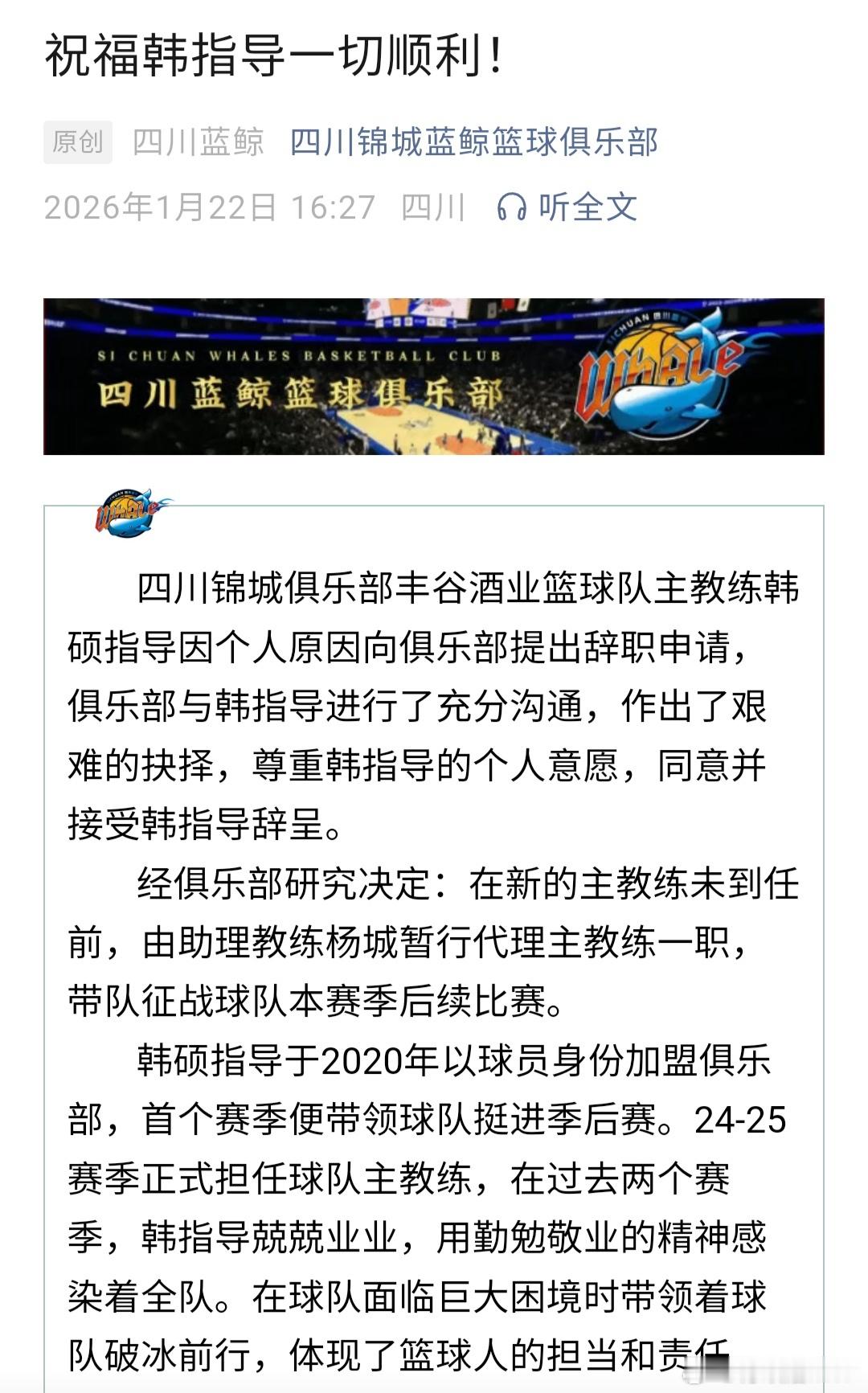 四川男篮官宣:韩硕指导因个人原因辞职,助教杨城暂时代理主教练职务。四川男篮本赛季17连败,至今一胜难求,韩硕指导辞职也算是一种解脱。韩硕辞去四川男篮主帅