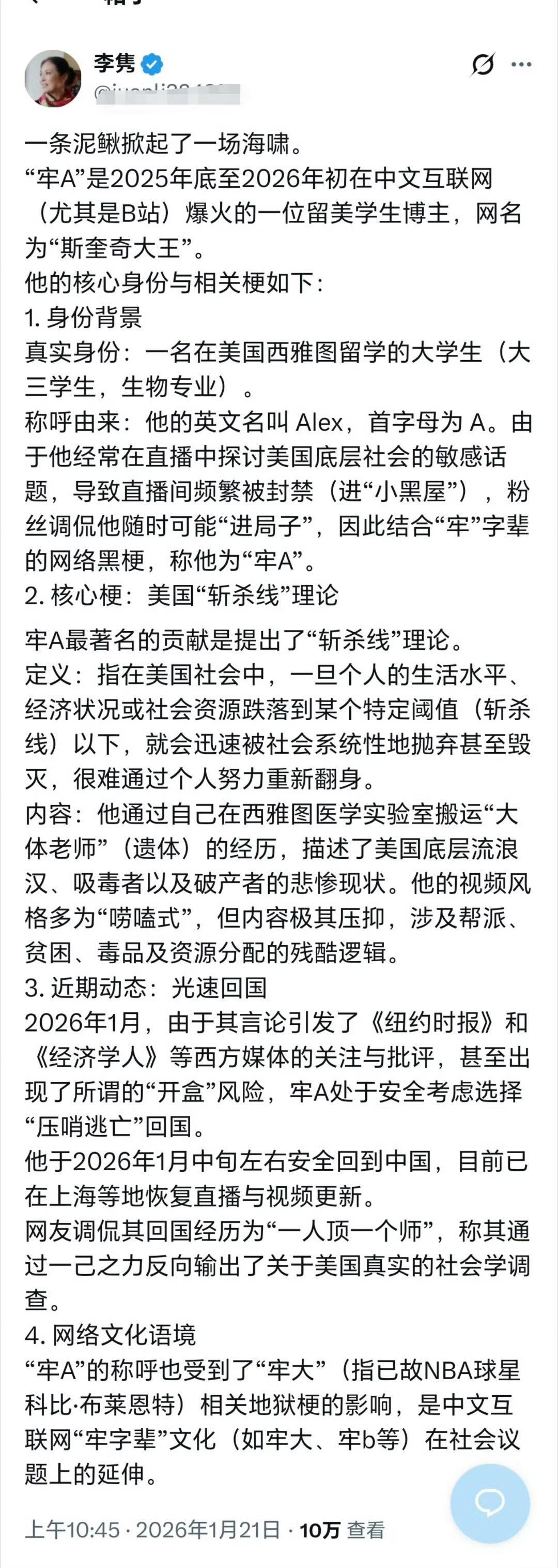 这就是要开盒牢A的李隽啊!管牢A叫泥鳅! 看照片年纪应该不算年轻了,咋不颐养天年,逗逗孙子,跳跳广场舞啥的呢?美国没有吗?美国街头只有大麻和僵尸吗?太搞笑了! 美国没有爱国主义教育,他们那的人没什么民族精神!纯正美国人都没有这么爱国!她一个半路出家,润过去的,咋这么热爱美国呢!贻笑大方![捂脸][捂脸][捂脸][捂脸][捂脸]牢a自曝