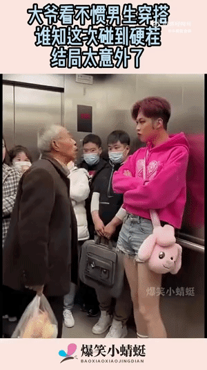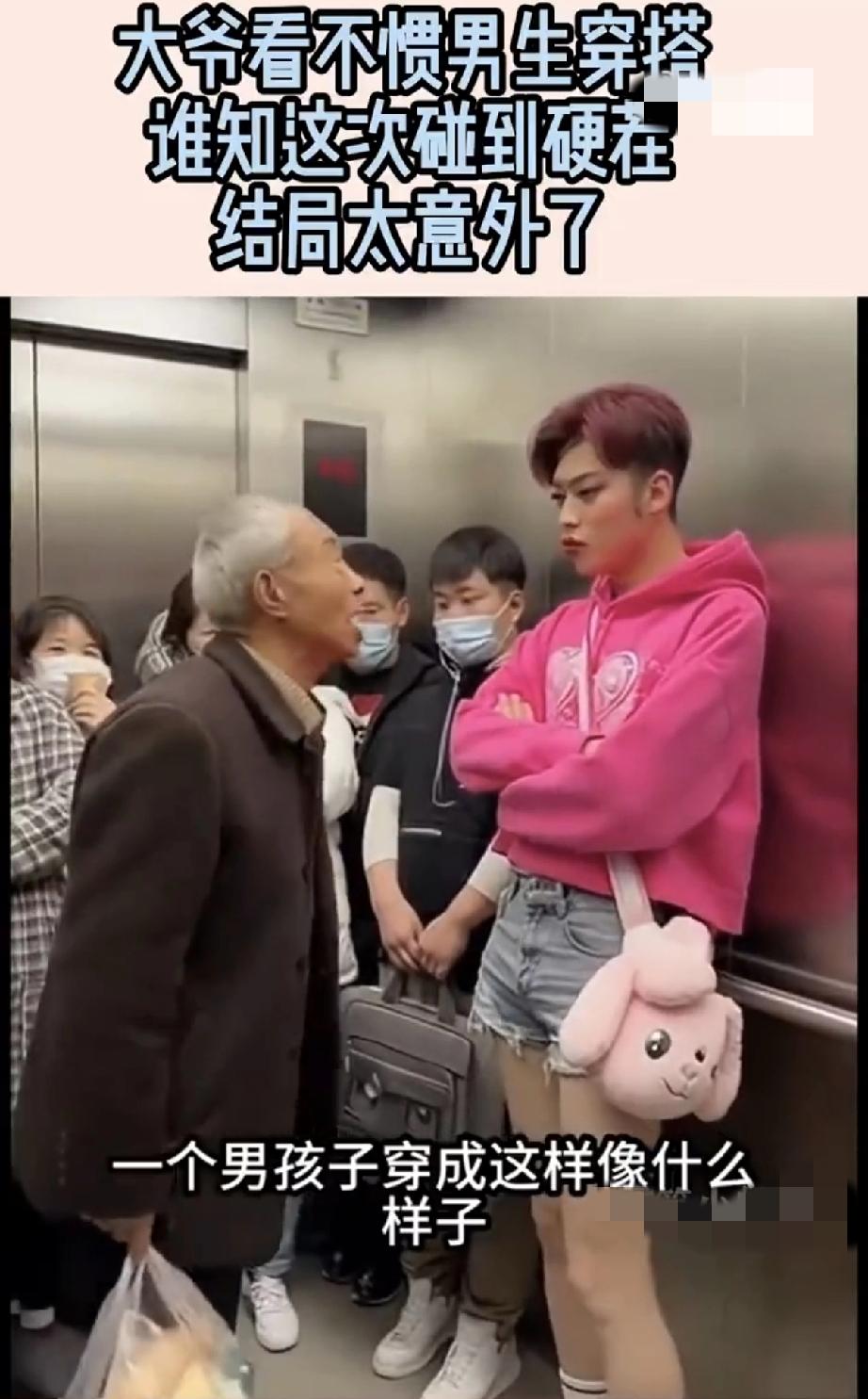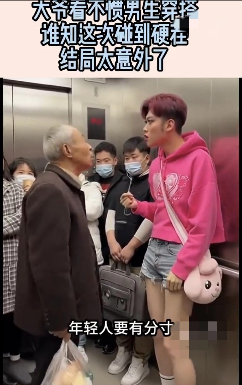 这位大爷说的没毛病,年轻人做事要有分寸! 在电梯里,大爷实在看不惯与他同行的年轻男子,打扮的妖里妖气,完全没有一副阳刚之气,大爷就狠狠怒斥道:一个大男人穿成这样,公共场合不害臊吗?年轻人做事要有分寸! 现在的好多年轻人穿的衣服真的让人看不懂了,你们认为大爷说的对吗?