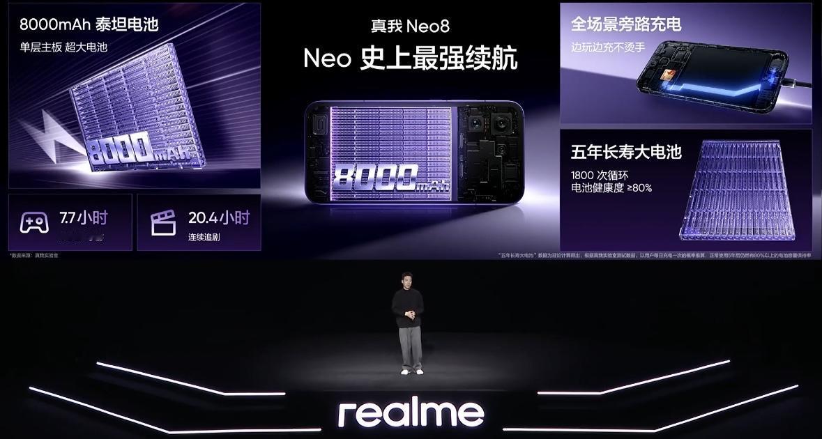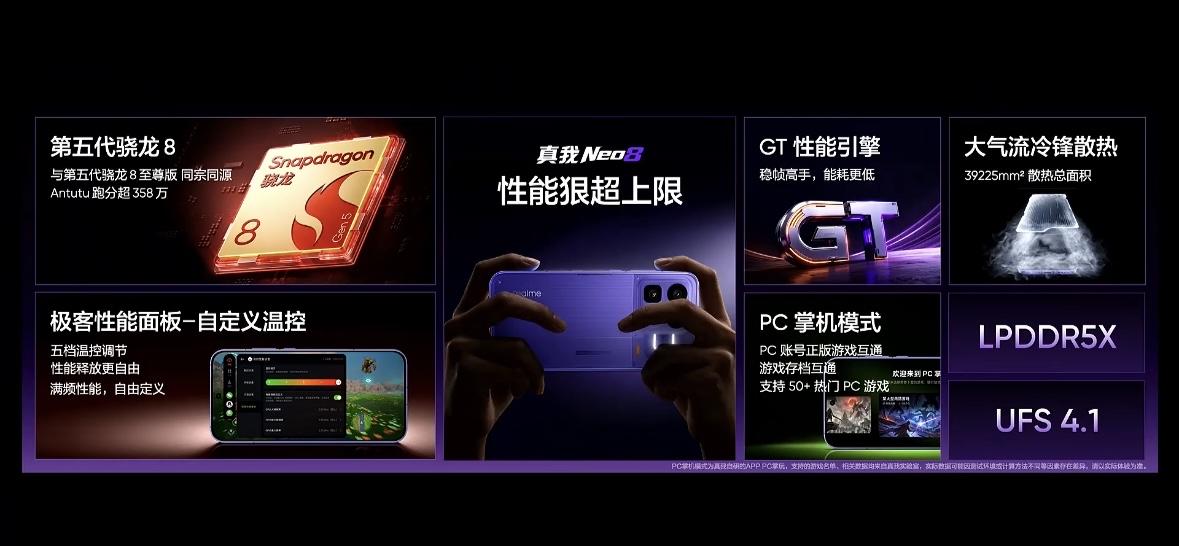 真我Neo8发布,具体配置如下: 6.78英寸2772*1272分辨率 三星M14直屏+165Hz超高刷 主流枪战手游 165Hz无限满帧 原生级120帧+1.5K超分 游戏温控自定义/频率自定义 PC掌机模式 骁龙8 Gen5+LPDDR5X+UFS4.1 前置16MP 后置50MP IMX896 OIS主摄+8MP超广+50MP 3.5X OIS潜望长焦 80W+8000mAh电池 3D超声波指纹 IP66+68+69防护&晶铠玻璃 X轴马达0809 双扬声器,NFC,红外遥控 双频GPS+三频北斗 苍穹信号芯片S1 金属中框+玻璃后盖 厚8.3mm,重215g