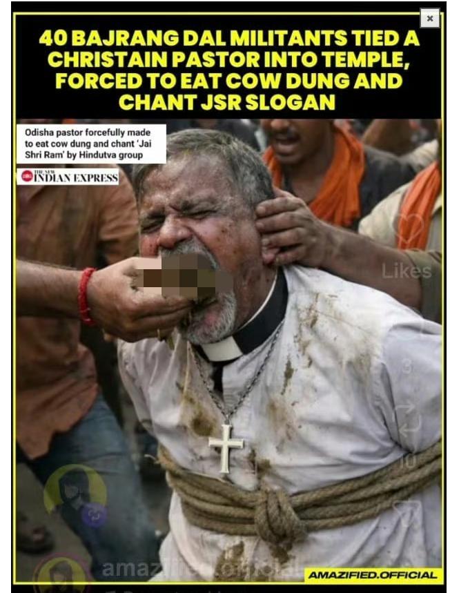 印度牧师遭暴徒强迫吃牛粪,警方反手起诉受害者?三哥这操作也太离谱了! 就在2026年1月4日,印度奥里萨邦发生了一件刷新三观的事:当地基督教牧师比平·比哈里·奈克,正在自家和家人、信徒一起祷告,突然冲进来40多个印度教团体“猴王军”的暴徒。 这群人上来就对牧师一顿棍打,还把只有已婚妇女才用的红色朱砂涂在他脸上,给他戴上拖鞋做的花环游街。更恶心的是,他们还强迫牧师吃下牛粪,甚至还逼他高喊印度教口号“赞美罗摩神”。 牧师的妻子赶紧跑到警察局求助,结果警方居然拒绝立刻出警。等牧师被送到警局后,不仅没得到任何医疗救助,还被反咬一口——警方指控他“强迫他人皈依宗教”,直接把受害者变成了被告。 要知道,这个村子里只有7户基督教家庭,在印度教群体里属于绝对少数。这种赤裸裸的宗教霸凌,加上警方的偏袒,让人看了后背发凉。 牛在印度教里被视为圣物,强迫吃牛粪不只是身体上的羞辱,更是对信仰的践踏。而警方的操作更让人无语,明明是受害者,却被反手起诉,这波操作真是把“双标”写在了脸上。 这件事也让我们看到,在印度少数宗教群体的生存处境有多艰难。暴力霸凌之后,连讨公道的机会都没有,这样的荒诞现实,实在让人唏嘘。无礼的印度人 印度宗教制度 印度极端宗教 印度暴徒 印度宗教习俗 印度牧师 印度教牧师