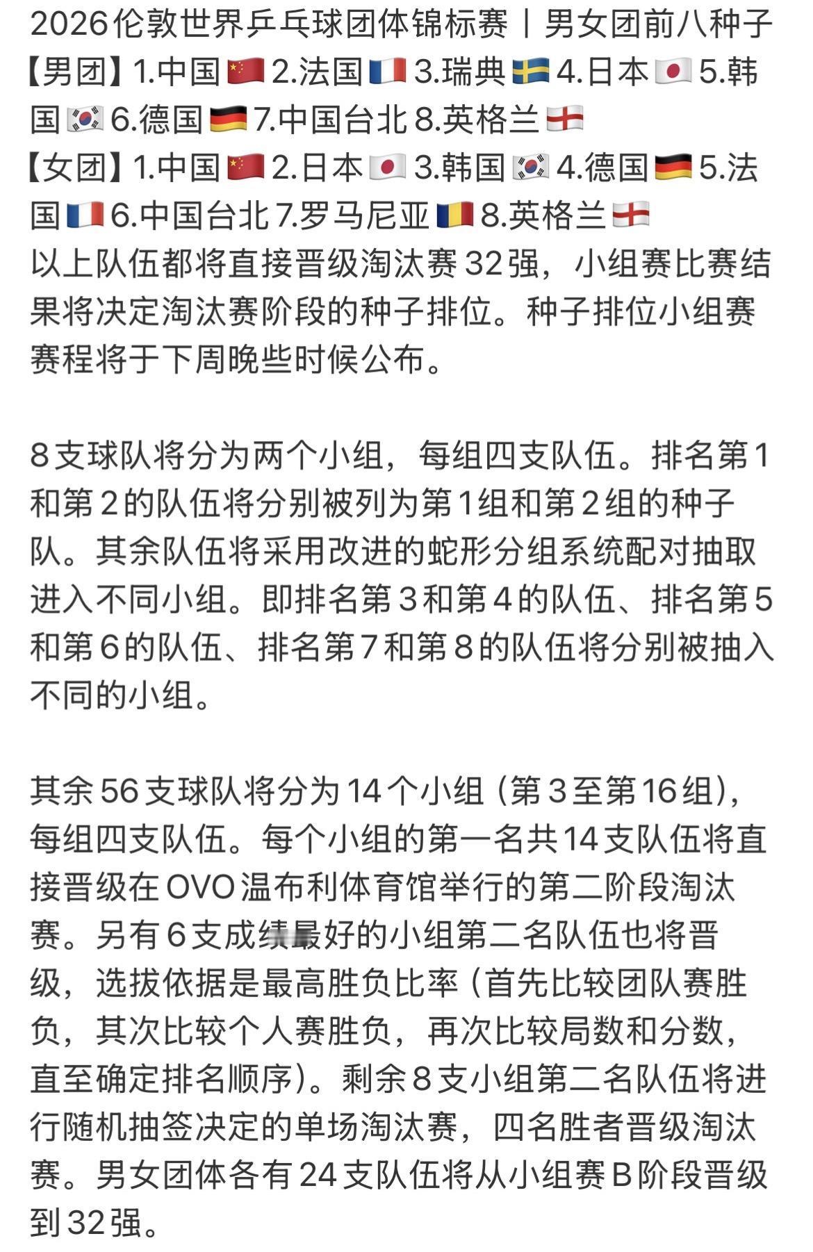 2026伦敦世界乒乓球团体锦标赛抽签仪式将于北京时间1月26日20:00举行