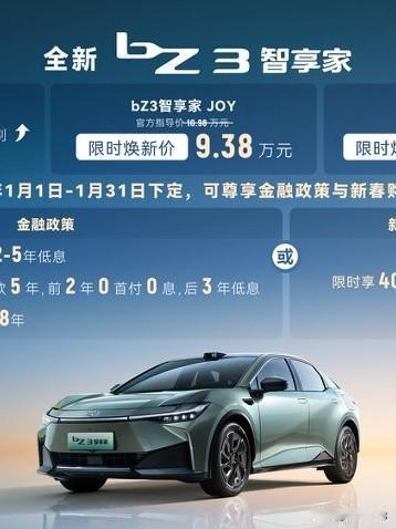 在如今的新能源市场,有一款纯电家轿上市了。它有着合资品质、优惠的价格、智能的配置,一汽丰田bZ3智享家B级纯电家轿以9.38万元起售,为我们掀起了B级纯电市场的大浪花。 丰田bZ3智享家这款车,有着2880mm的超长轴距,宽敞的内部空间能坐下了我们全家老少三代。这款车有着616 km的续航,又搭配了L2的智驾系统,丰田bZ3智享家用合资的品质带来了丰田B级纯电家轿的新标杆。 bZ3智享家以丰田的合资高品质,仅用9.38万元就给大家带我们走进了一个B级纯电家轿的“智、享、家”的新时代。是我们家庭的首选!