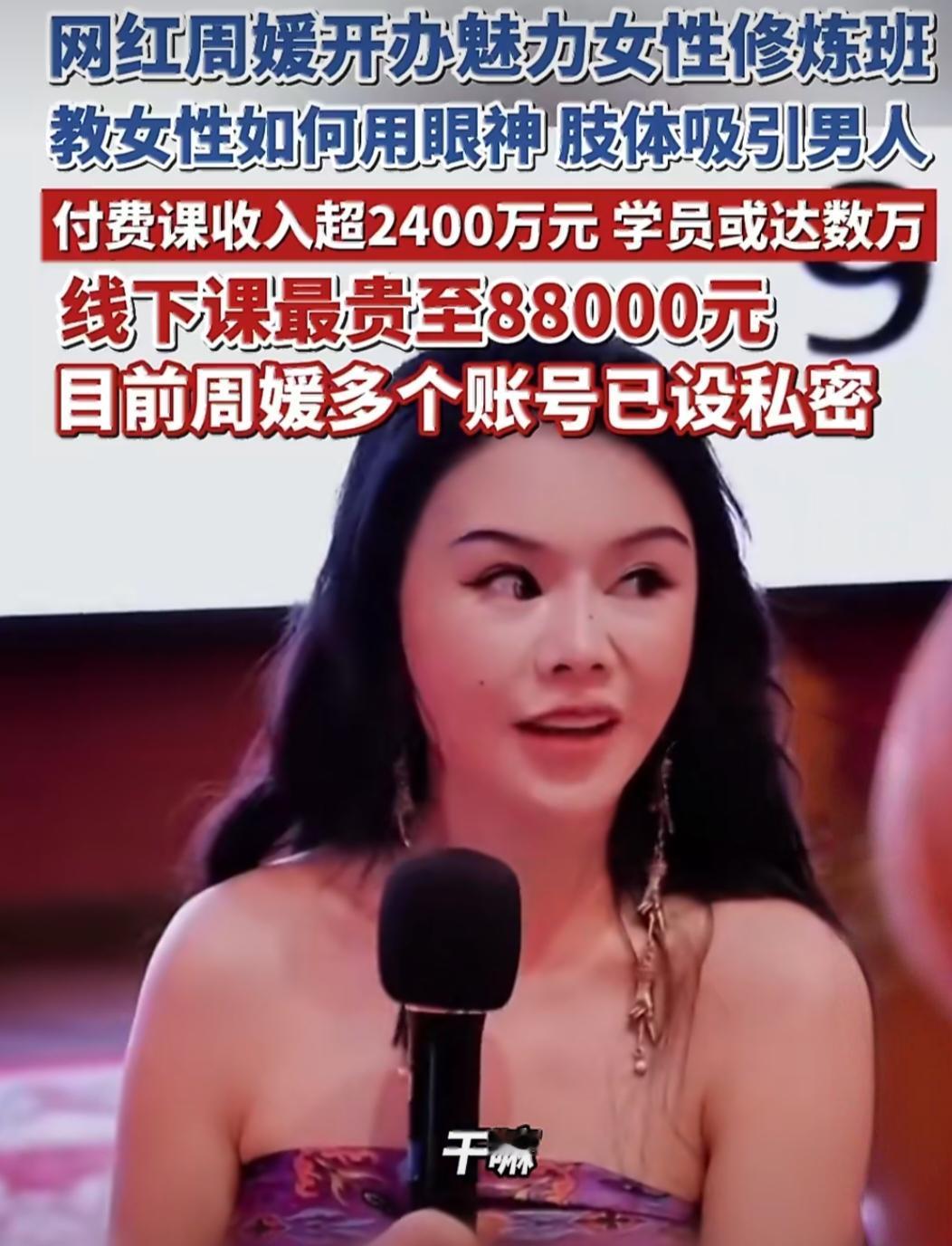 靠“抛媚眼”狂赚2400万,网红周媛账号被封!这钱赚得太恶心。 “眼神给出去,魅力收回来”,就凭这句魔性口号,网红周媛把“性商课”卖出了天价:线上课999元,线下导师班最贵8.8万,几年下来狂揽2400万,学员多达上万人。 她教的所谓“X型回眸”“肢体勾引”,本质就是把女性魅力异化成讨好男性的工具,包装成“女性觉醒”的收割套路。更离谱的是,8.8万的课程还承诺“30%分润”,拉人头拿提成,活脱脱的传销玩法。 如今周媛的主账号被封,算是大快人心。但这事细想更让人后怕:她的课程为什么能火?无非是抓住了部分女性在婚恋里的焦虑,把“讨好男性”包装成“自我提升”,让她们心甘情愿掏腰包,陷入“焦虑-消费-更焦虑”的死循环。 这种课不仅扭曲了两性关系,更把女性的价值困在“如何让男人喜欢”的低级逻辑里。真正的女性魅力,从来不是靠媚眼和套路换来的,而是来自独立的人格和自我价值的实现。 周媛被封只是开始,希望这场闹剧能让更多人清醒:别再为这种收割焦虑的“智商税”买单了。网红 黑白颠周媛多个账号设为私密 黑白颠周媛多个账号设为私密 直播间