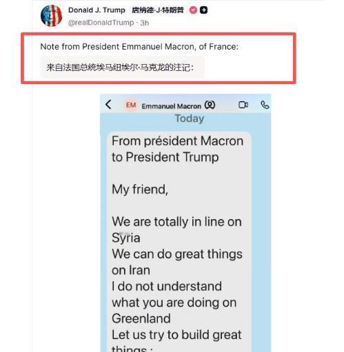特朗普又走了一步臭棋! 他公开了马克龙发给他的短信,这无异于自掘坟墓。 特朗普心里那点小算盘太明显了,就是想给马克龙来个下马威,让他搞清楚自己几斤几两,明白法国该听谁的、该怎么配合美国的节奏。 可他万万没想到,这波操作纯属搬起石头砸自己的脚,把本来就不算稳固的盟友关系搅得更乱,还让自己成了国际上的笑柄。 马克龙在短信里其实挺给面子,一口一个 “我的朋友”,本来是想跟美国搭伙,在叙利亚和伊朗这些事儿上一起发力,好好合作一把。 可他实在摸不透特朗普在格陵兰岛那边瞎折腾到底图啥,心里犯嘀咕,就提议达沃斯论坛之后,在巴黎开个 G7 会议,还想邀请乌克兰、丹麦这些相关国家一起聊聊,顺便跟特朗普吃顿晚餐,把事儿说开。 结果这份带着合作诚意的私信,转头就被特朗普晒到了社交媒体上,全文公开,一点情面都没留。 特朗普大概是觉得自己特能耐,想让全世界看看,马克龙私下里对他多客气,转头却公开拒绝加入他搞的那个 “和平委员会”,纯属当面一套背后一套。 可他忘了,外交场上最讲究的就是个信任和分寸,私下沟通的内容随便往外捅,这是最基本的底线都没守住。别说盟友了,就算是普通朋友,也受不了这种背后捅刀子的操作。 马克龙当场就炸了,戴着墨镜在达沃斯论坛上直接开怼,说不能接受那种靠强权说了算的世界秩序,还吐槽美国动不动就加关税的做法根本没法忍。 本来答应好的巴黎会议和晚餐,直接一句话取消,记者问他特朗普还是不是盟友,他都懒得回应,只说这话该让特朗普自己回答,言下之意再明显不过 —— 就这操作,配不上盟友俩字。 这事儿还没算完,连锁反应一波接一波。欧盟直接站出来力挺法国,冯德莱恩放话回应会坚定不移,还启动了 “反胁迫工具”,准备对 930 亿欧元的美国产品动手,跟美国硬碰硬。 以前欧洲对美国的单边操作大多是嘴上抱怨几句,这次是真的动了肝火,不再忍气吞声。 其他盟友也吓得不轻,北欧国家直接暂停了跟美国籍北约官员的情报共享,谁知道自己私下跟美国说点啥,下次会不会也被公开处刑。 英国向来跟美国走得近,这次也没人买账,自由民主党党魁直接骂特朗普是 “国际流氓”,斯塔默政府也第一次公开反对美国的关税威胁。 就连北美后院都不稳了,加拿大不仅模拟了应对美军入侵的演习,还在格陵兰岛设了领事馆、加强驻军,墨西哥也直接拒绝了特朗普搞的 “美国湾” 更名计划,说这是殖民主义的老一套,早就过时了。 特朗普本来想靠公开短信敲打马克龙,让欧洲国家乖乖听话,结果反倒把大家都逼到了自己的对立面。 他搞的那个 “和平委员会”,每个席位标价 10 亿美元,本来就被质疑是想架空联合国,马克龙不加入,他就威胁要对法国葡萄酒和香槟加征 200% 关税。 现在又来这么一出,彻底让欧洲看清了美国的霸权嘴脸 —— 顺我者昌,逆我者就用关税和公开隐私来威胁。 更有意思的是,俄罗斯那边乐见其成,趁着美欧闹矛盾的功夫,直接发动大规模打击,动用了几十枚导弹和几百架无人机,在战场上占了不少便宜。 泽连斯基也不再一门心思指望美国,转而支持丹麦在格陵兰岛的领土主张,变相批评美国的不当干预,让美国在乌克兰问题上的话语权又弱了几分。 特朗普这步棋走得是真够蠢的,他以为公开短信能彰显自己的强势,让马克龙服软,殊不知外交不是小孩子过家家,靠威胁和羞辱根本赢不来尊重。 盟友之间讲究的是互相尊重、彼此信任,一旦信任没了,后续的合作就成了空谈。 现在好了,不仅没能教训到马克龙,反而让美国的国际信誉一落千丈,盟友体系出现了明显的裂痕,北约内部离心离德的趋势越来越明显。 以后哪个国家还敢跟美国私下沟通?谁都怕自己的私信、通话被随便公开,到时候颜面扫地。 特朗普想靠这种手段让别人配合,结果却是把路越走越窄,身边的盟友一个个都在疏远。本来美国在国际上的影响力就不如以前,经他这么一折腾,更是雪上加霜。 说白了,特朗普就是太把自己当回事,觉得美国是老大,别人就必须听他的,稍微有点不顺心就翻脸不认人,用极端手段施压。 可时代早就变了,没有哪个国家愿意心甘情愿当别人的跟班,尤其是欧洲这些有自己立场和实力的国家,更不会容忍这种羞辱性的操作。 这步臭棋算是彻底暴露了特朗普的外交逻辑 —— 没有什么原则可言,只有利益和霸权。可这种逻辑在当今世界根本行不通,合作共赢才是主流,靠威胁、恐吓和破坏信任来达到目的,最终只会自食恶果。 特朗普以为是给马克龙上了一课,实际上是给自己挖了个大坑,把美国的盟友关系、国际信誉都埋了进去,妥妥的自掘坟墓。 现在美欧关系闹得这么僵,盟友之间互相猜忌,美国想再让欧洲跟以前一样言听计从,基本上是不可能了,这后续的烂摊子,还得他自己来收拾。