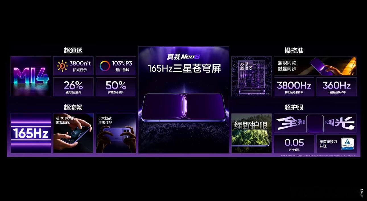 真我Neo8这块屏幕,真的强!这块屏,狠起来连自己都怕!通透感直接拉满——M14旗舰发光材料,亮度爆到6500nit,大太阳下照样清楚!色彩浓郁丰富,还耐用到离谱,寿命提升一半。打游戏?直接上165帧!画面多、响应快,指哪打哪。MOBA、吃鸡、竞速全支持,跟手性优化12%,丝滑到像开挂。操控更吓人,新一代妙感触控芯,点按、滑动又快又稳,响应提升8ms,简直人机合一。护眼也到位,全亮度DC调光,几乎没频闪,蓝光从源头砍掉。还能主动提醒你休息,长时间玩眼睛也不累。这屏,方方面面都狠超上限,用过就回不去了!重点性能同样越级!这,你敢想吗?
