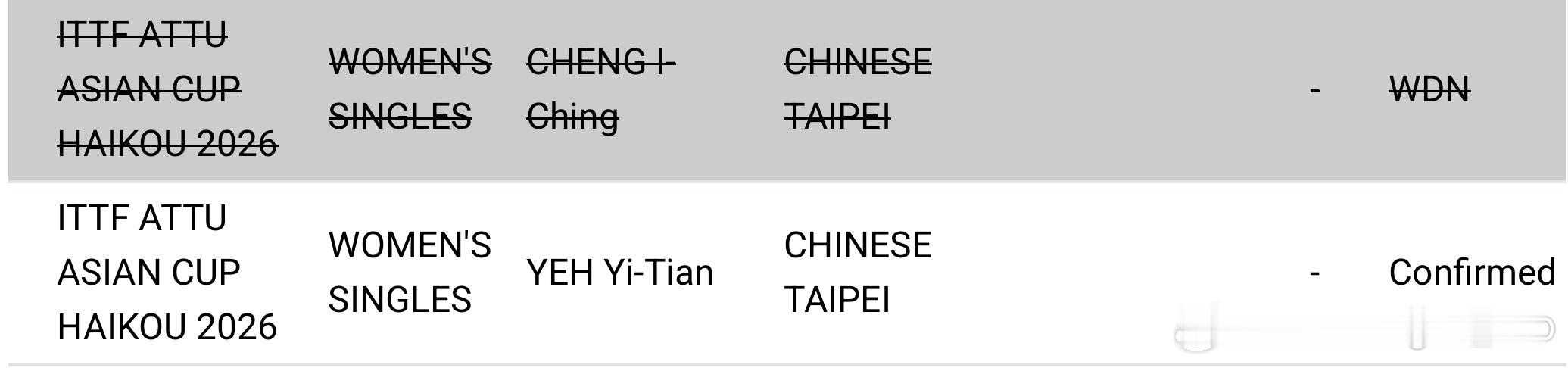 林昀儒、郑怡静退赛,张佑安递补中国台北队2026海口亚洲杯目前名单女单: 叶伊恬 李昱谆 简彤娟男单: 冯翊新 郭冠宏 廖振珽 张佑安