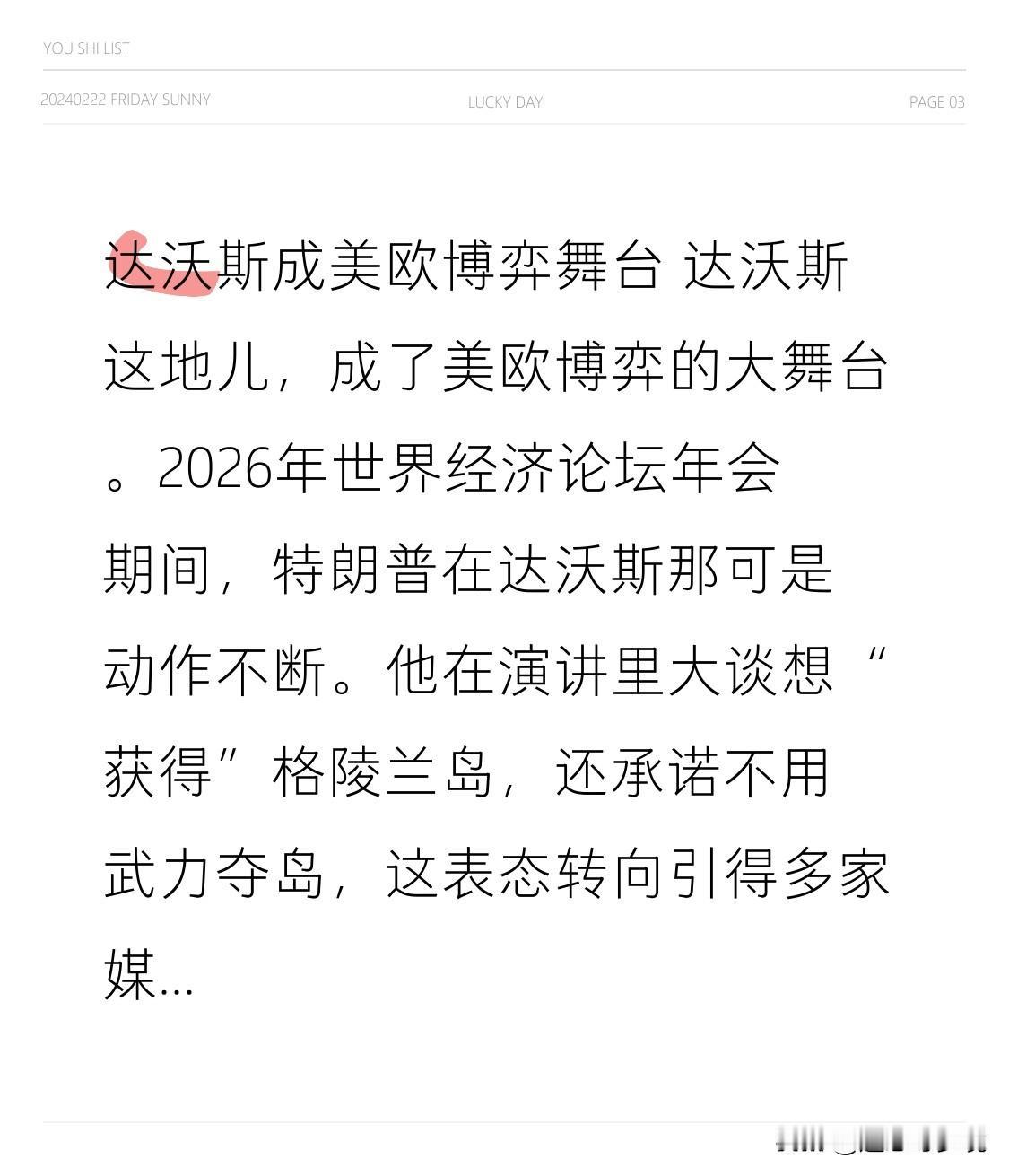 达沃斯成美欧博弈舞台 达沃斯这地儿,成了美欧博弈的大舞台。2026年世界经济论坛年会期间,特朗普在达沃斯那可是动作不断。他在演讲里大谈想“获得”格陵兰岛,还承诺不用武力夺岛,这表态转向引得多家媒体关注。 赴达沃斯前夕,特朗普宣布要对丹麦等多个欧洲国家输美商品加征关税。不过在达沃斯和北约秘书长等欧方领导人会面后,他发文称就格陵兰岛事宜达成“框架性”协议,还取消了原定于2月1日生效的关税。但协议细节没透露,只说对北约成员国都有利。这美欧围绕格陵兰岛的博弈,后续走向还真让人捉摸不透。