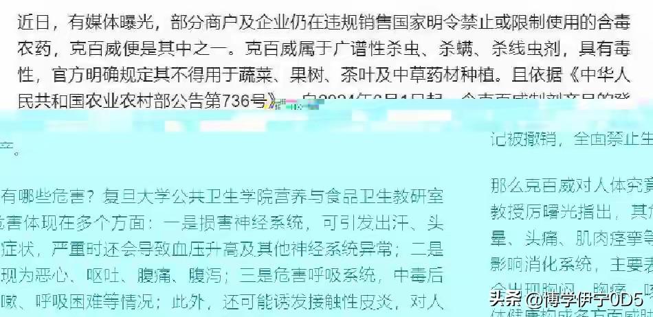 湖北村民实名举报“毒菜地”!0央视曝光“毒蔬菜”!0.08克便可致器官衰竭,已流窜到全国多地 古人云:“民以食为天,食以安为先。”但我们餐桌上看似翠绿欲滴的蔬菜,背后可能藏着一个不为人知的惊天内幕。就在近日,一封来自湖北天门岳口镇普通居民的举报信,撕开了当地蔬菜种植黑幕的一角,更让央视曝光了一种令人闻之色变的“超级毒药”。 一、 一封举报信揭开“惊天黑幕” 事情发生在去年年底。湖北天门市岳口镇的一些居民坐立难安,他们发现自家附近的田地里,总有一些不对劲的动静。最终,几位正义感爆棚的居民决定不再沉默,他们联合给央视写了一封实名举报信。 信中揭露了一个触目惊心的细节:在岳口镇的一片菜地里,有不少种植户为了追求产量、杀灭虫害,正在偷偷使用一种名为**“呋喃丹”**的剧毒农药。这可不是普通的打药,而是在明令禁止多年后,依然有人顶风作案的“绝户式”种植。 二、 何为“呋喃丹”?只需绿豆的十分之一,器官衰竭! 究竟什么是“呋喃丹”?为何专家将其称为“超级毒药”? “呋喃丹”,学名克百威,是一种氨基甲酸酯类杀虫剂。它最可怕的地方在于其极高的毒性。专家指出,这种药的致死量极低,根本不需要整瓶整瓶地洒。 想象一下一颗绿豆的大小,我们将其切成十份,只需其中的一份(约0.08克),如果被人体摄入,就足以导致严重的器官损伤!对于抵抗力较弱的老人、孩子来说,这更是一道鬼门关,风险直接翻倍。一旦中招,轻则头晕恶心、流涎不止,重则呼吸衰竭、多器官受损,甚至危及生命。 更让人绝望的是,它具有内吸性。这意味着药液不仅喷在叶面上,还会被植物吸收到根、茎、叶、果的每一个细胞里。一旦施用,毒药就渗入了蔬菜的“血液”里,简单的清洗、去皮,甚至烹饪加热,都很难将其彻底去除。 三、 国家早已明令禁止,为何屡禁不止? 事实上,国家对于这种农药的管控早在几年前就已收紧。农业农村部早在前年就发布公告,全面禁止含有**克百威**成分的农药生产、销售和使用,特别是在蔬菜、水果、茶叶、中草药等直接入口的农作物上,是绝对的红线。 既然法律高悬,为什么在湖北天门的这片地里,还有人敢偷偷摸摸地用? 答案逃不过一个“利”字。 一方面,呋喃丹杀虫效果确实“立竿见影”。对于那些被地下害虫咬得不成样子的根茎类蔬菜,喷点普通药不管用,一勺“呋喃丹”下去,虫死光,菜长得快,卖相好。 另一方面,受限于基层监管力量薄弱,一些种植户便心存侥幸,玩起了“猫鼠游戏”。白天不敢动,趁着清晨或深夜偷偷喷洒;明面上买正规药,暗地里通过非正规渠道搞来违禁药。正如老百姓常说的那句:“上有政策,下有对策”,但这些“对策”,赌上的却是消费者的健康。 四、 毒菜已流向多地?我们该如何自救? 此次曝光并非个例,这种“毒蔬菜”很有可能已经流窜到了全国各地的农贸市场。作为普通消费者,我们虽然无法去田地里盯着农民打药,但依然可以通过以下几种方式,最大程度地降低风险: 1. 拒绝“完美无瑕”的蔬菜 如果发现蔬菜叶子一点虫眼都没有,表面光亮得像打了蜡,或者形状异常硕大,反而要提高警惕。这可能是过量使用了高毒农药的结果。 2. 闻味辨别 刚买回来的蔬菜,可以闻一闻。如果有刺鼻的异味、类似大蒜味或者特殊的化学药剂味,千万不要买,也不要觉得洗洗就能吃。 3. 严格执行“清洗四步走” 虽然对于内吸性毒素清洗效果有限,但依然必要: 流水冲洗:去除表面残留。 小苏打浸泡: 农药多为酸性,用小苏打水浸泡10-15分钟有助于中和分解。 焯水处理:很多农药在高温下会加速分解,做菜前尽量焯水1-2分钟。 去皮:黄瓜、茄子、萝卜等,能去皮的尽量去皮,这是最有效的去毒方式。 4. 来源多样化 不要长期只买某一个产地、某一个摊位的菜。分散采购风险,避免由于单一来源污染导致蓄积中毒。 0.08克的剂量,看似微不足道,却可能成为压垮一个家庭健康的最后一根稻草。湖北天门居民的举报,是给全社会敲响的一记警钟。 食品安全不能仅靠居民的“举报信”来维持,更需监管部门重拳出击,严查违禁农药的地下销售链条,让那些黑心菜农付出惨痛代价。在此也呼吁所有种植户:别为了多赚那几块钱,就把良心给“毒”没了! 请转发提醒身边亲友,买菜擦亮眼,切莫让“毒蔬菜”上了自家的餐桌!
