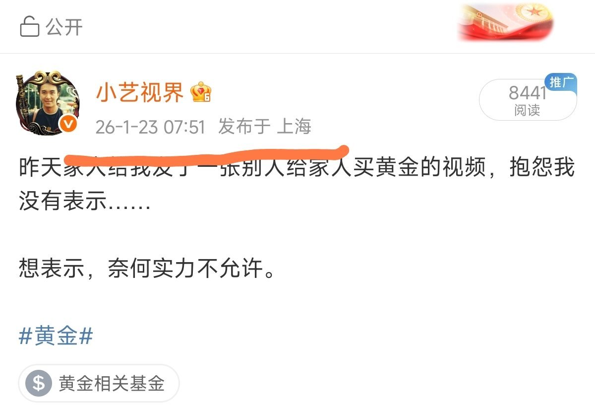 昨天家人给我发了一张别人给家人买黄金的视频,抱怨我没有表示……想表示,奈何实力不
