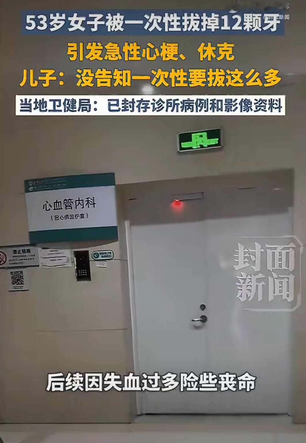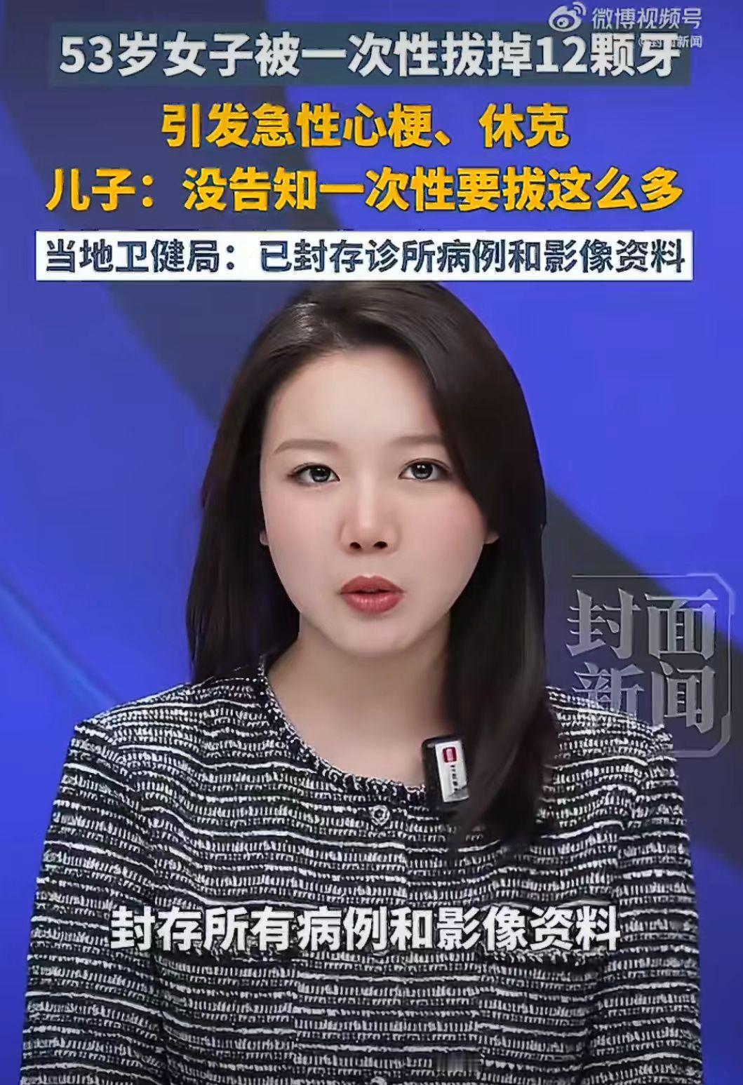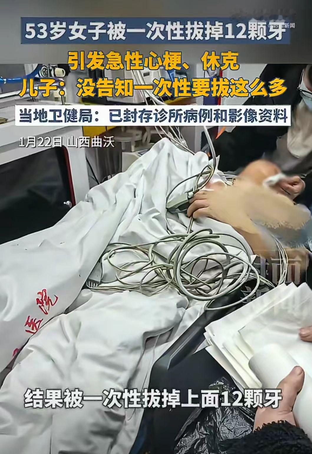 牙疼不是病,疼起来要人命。 山西一名53岁的大妈因为牙疼,到牙科诊所看牙。 医生一口气拔了12颗,大妈引发心梗,休克了。 大妈本来是想种牙的,到牙科诊所一看,医生说要先拔牙,随即医生还让签了术前同意书。 大妈通过询问知道自己要拔3颗牙,也不是很多,就同意了,结果医生自作主张,把大妈的12颗上牙全拔了。 这医生胆子也是真大,正常拔牙一次最多拔两颗,这个医生竟然一次拔了12颗。 大妈回家后,家人发现大妈的下巴脱臼合不上了,人也没有精神了,就连忙把人送到医院抢救。 送到医院被诊出急性心梗,口腔出血不止,人也出现了失血性休克。 在医院住了20多天后,大妈情况有所好转,大妈儿子去找诊所时,才发现这家诊所在1月6号就注销了。 真的不理解,这个牙医为什么要一次性拔掉12颗牙,难道不知道一次不能拔那么多的牙吗? 为了安全起见,看病拔牙等还是要到正规医院,不要随意到诊所看病拔牙。 你觉得诊所有责任吗?需不需要赔偿? 牙疼 牙神经疼 拔牙止疼 拔牙