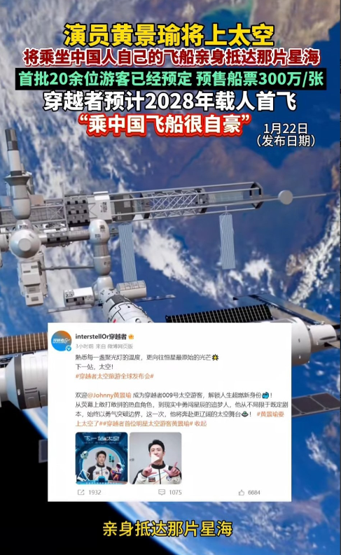 黄景瑜要上天了——”乘中国飞船很自豪” 将乘坐中国人自己的飞船亲身抵达太空 首批20余位游客已经预定 预售船票300万/张 穿越者预计2028年载人首飞… “很荣幸将成为一名太空游客 乘坐我们中国人自己的飞船” 黄景瑜期待和穿越者们并肩穿越天际 ”下一站,太空”。