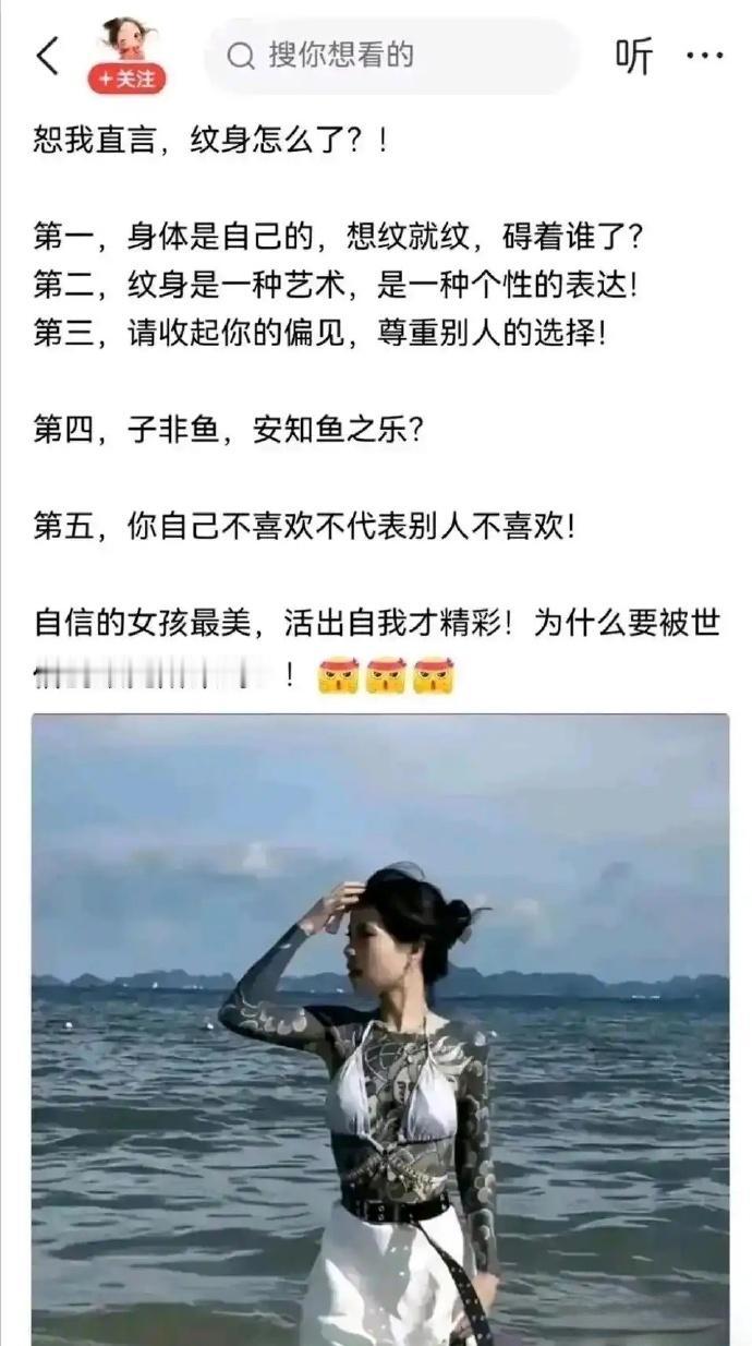 还以为穿着黑色长袖。年轻时候的一时冲动以后一定会后悔,那么干净是皮肤非要弄的面目全非,真可惜。 你喜欢不代表别人也喜欢,你既然有自由去做你想做的事,也就应该尊重别人自由去表达别人的观点。 如果你自称自己喜欢做的事情因为别人的评论而左右情绪,那,你未必真的喜欢,或者说,你的这份喜欢里,参杂着大量的需要外界认同的虚荣心。