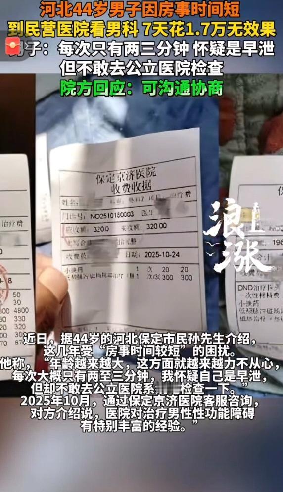 河北男子孙先生,藏着不为人知的困扰——房事时间短,只有2、3分钟。为此非常自卑,又羞于去公立医院问诊,只好默默在网上搜索。 从网上了解到一家保定京济的民营医院,通过微信客服咨询服务,得知这家医院是专治男性性功能的专科医院,包括“阳萎早泄,前列腺炎”,并进一步告知“公立医院采用的是药物治疗,民营医院的仪器或手术从未在正规医院使用过”。言外之意他们的医术和医疗设备远超公立医院。这大大打消了孙先生的顾虑。 于是孙先生亲赴医院做了一系列检查 ,医生告知“药物治疗收效甚微,要想根治必须手术”。孙先生虽然对手术有恐惧心理,但只要能解决难言之隐,吃点苦算什么,便接受了医生的建议。 手术过后,医生又以病情严重为由,光手术不能根治,给孙先生推荐了进一步治疗的理疗项目:尿道清洗、神经修复等。这些项目费用高昂,单次收费就高达6700元。短短7天消费累计高达1.7万元。 可是,花了钱吃了苦受了罪,效果却没有丝毫改变。本想给妻子一个惊喜,给自己一份自信,没想到却带来更大的心理和经济负担。 孙先生鼓足勇气在网上问诊了一家三甲医院,得到的答复是“这类病在公立医院都是药物治疗,民营医院的治疗手段正规公立医院从来不用”。 孙先生听后浑身发抖,终于醒悟掉进了医疗陷阱,可世上没有后悔药,孙先生只好向保定京济提出退款。但院方只承认退3500元,当地卫健局回复“程序无问题”。看来,孙先生不但钱打了水漂,而且白白吃苦受罪 ,为自己的面子买了单。 说到底,有些民营医院就是利用男性隐私牟利 ,抓住男性爱面子的特点,制造焦虑情绪,夸大治疗效果,引诱患者,这是他们的生存策略。 有的甚至把无病说成有病,把小病说成大病,把本该药物治疗说成手术治疗,目的只有一个,就是把患者视作提款机。 前些年央视曝光的遵义欧亚医院就是其中的典型案例。“没病造病,术中加价,持刀逼刷pos机”,那肆无忌惮,疯狂敛财演绎到了极致。受害人超2万,涉案资金2.39亿元,让人不寒而栗,曝光后最终被毁灭。 网友一针见血:“民营医院将男性面子焦虑转化为按克售卖的黄金”“男人的难言之隐,不能成为被宰的理由”直击人心。 奉劝大家,病急千万不要乱投医,正规医院是首选。面子在安全面前不值一提。 还应该提高维权意识这根弦,保存就诊记录,遇到医疗骗局及时投诉,保证自己的合法权益。 医院生存的核心是技术过硬,是信任和口碑,而不是把患者当韭菜的收割机。只有过硬的技术,良好的口碑,才能有更好的发展,才能长久生存下去。