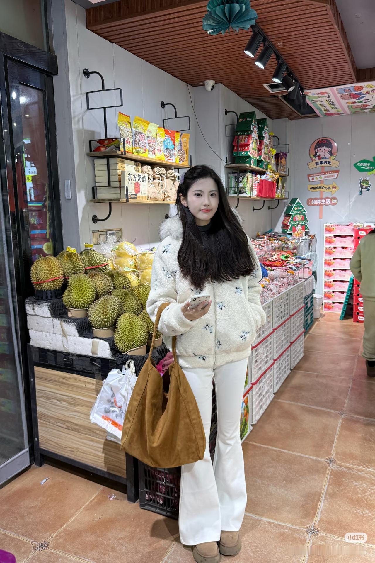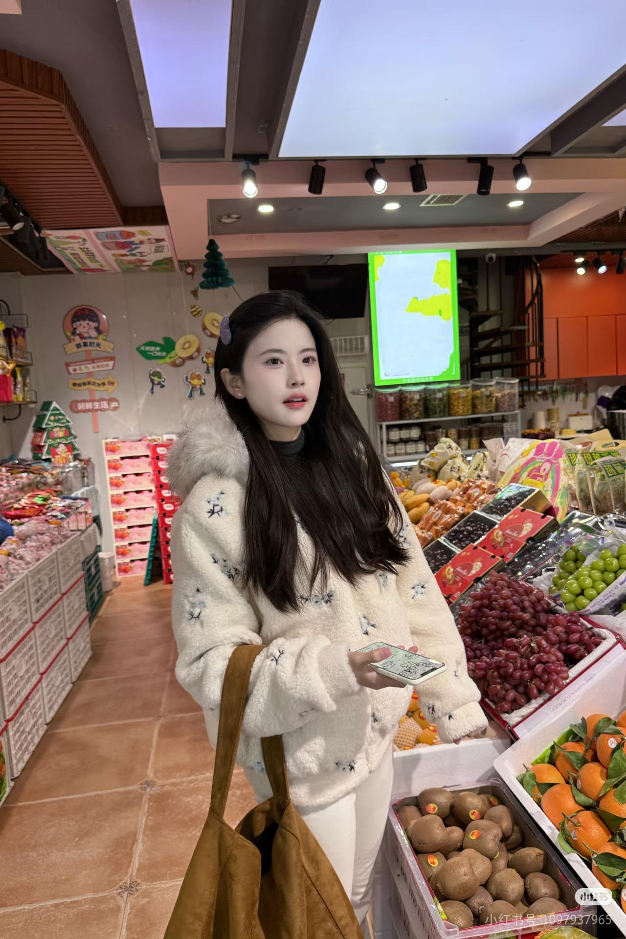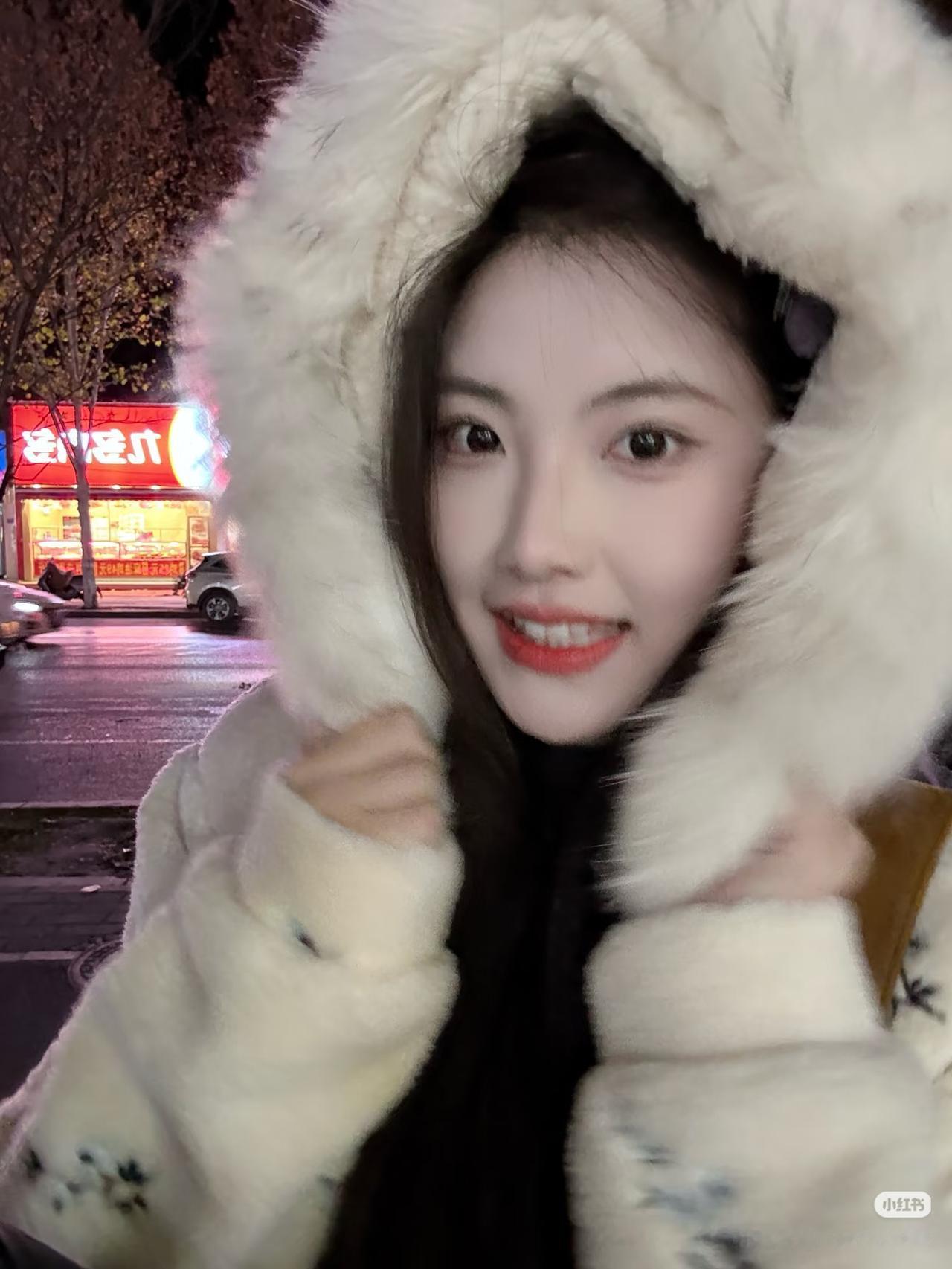 夜晚街头的甜美少女,毛绒外套与微笑相得益彰
