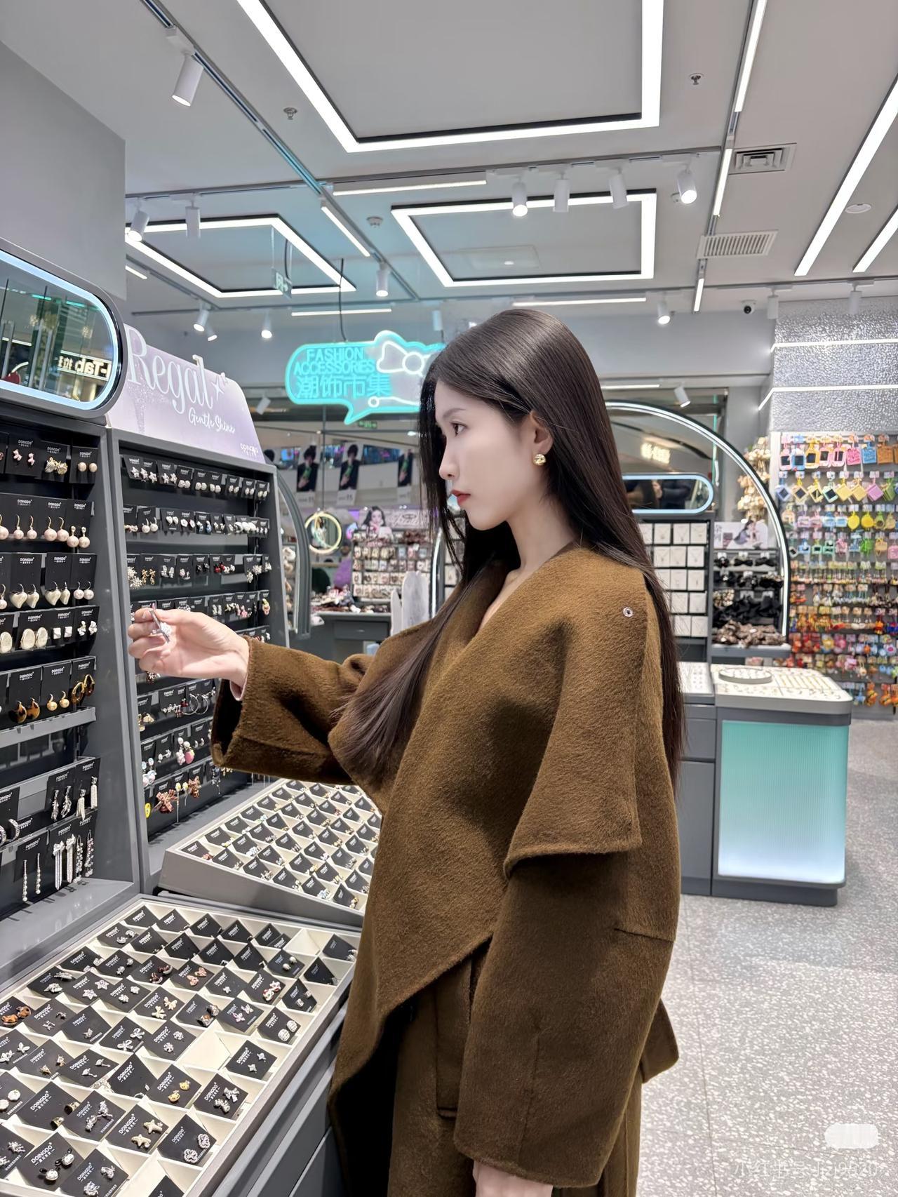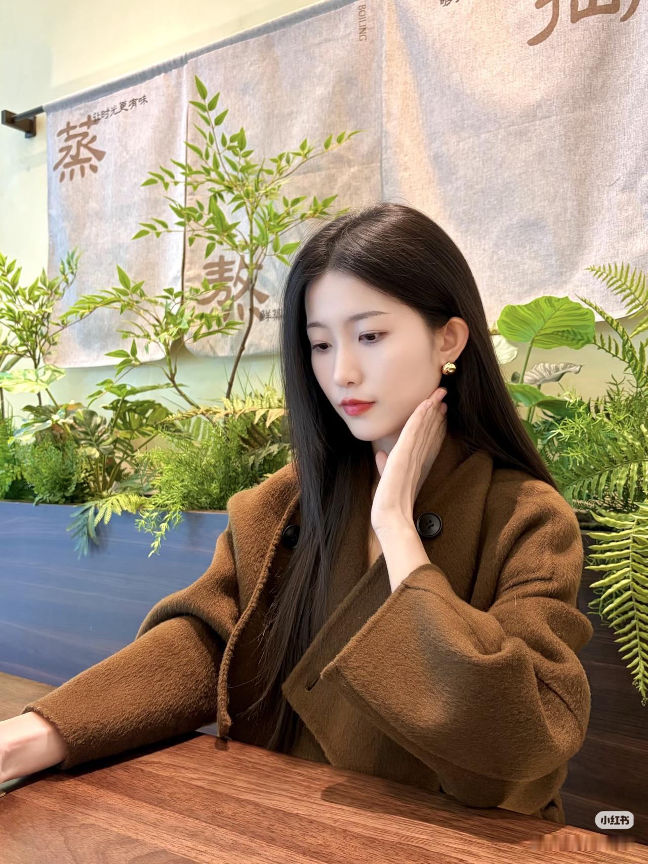 粉衣少女倚树旁,轻抚发丝意自闲。