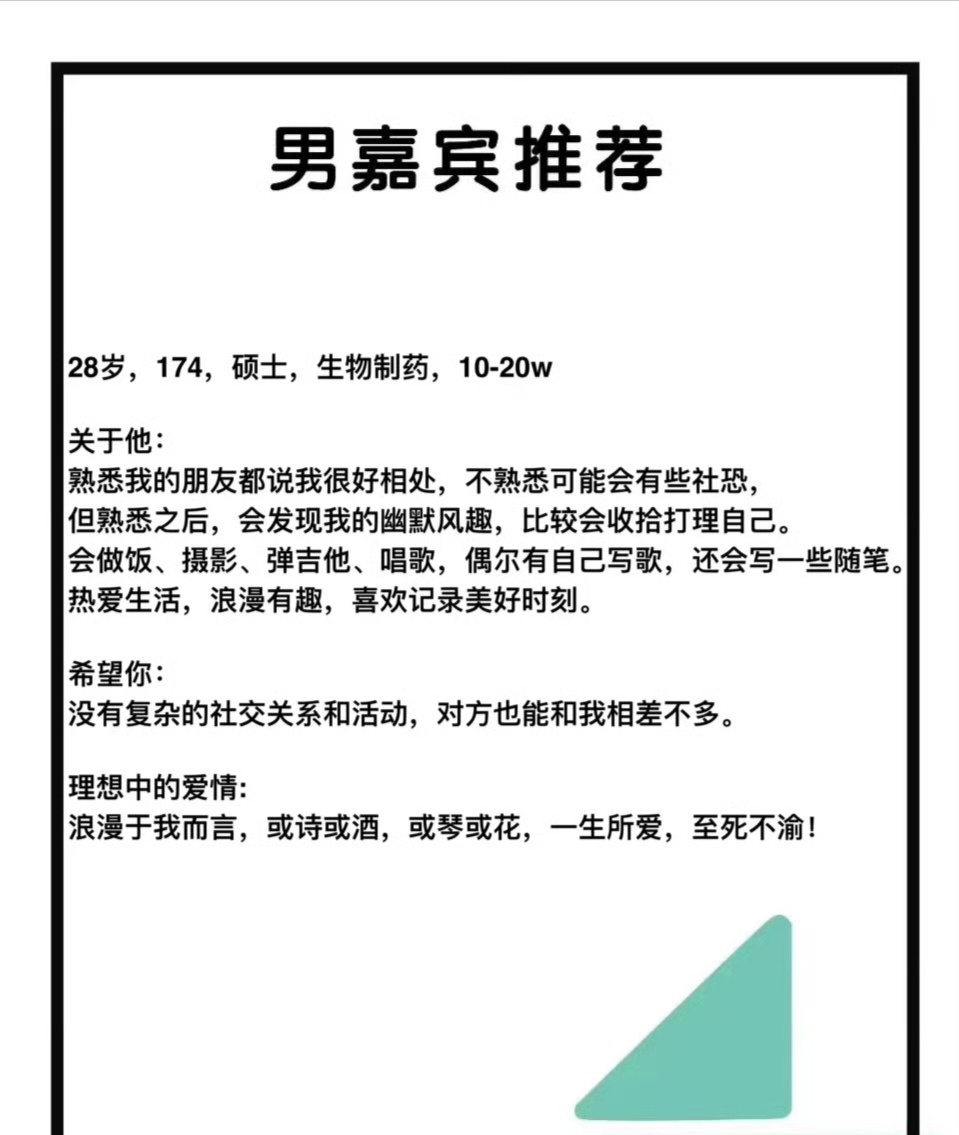 成都征婚【第7541号】97年男生,身高174,研究生,生物制药,年收入10-20;幽默风趣,喜欢做饭/摄影/唱歌/弹吉他,偶尔写歌。希望女生圈子简单,热爱生活… 详情戳图↓特约嘉宾 ——有意者请私信小美,投稿/加群/周末相亲会/小红娘1V1牵线 请私信! 成都征婚成都相亲