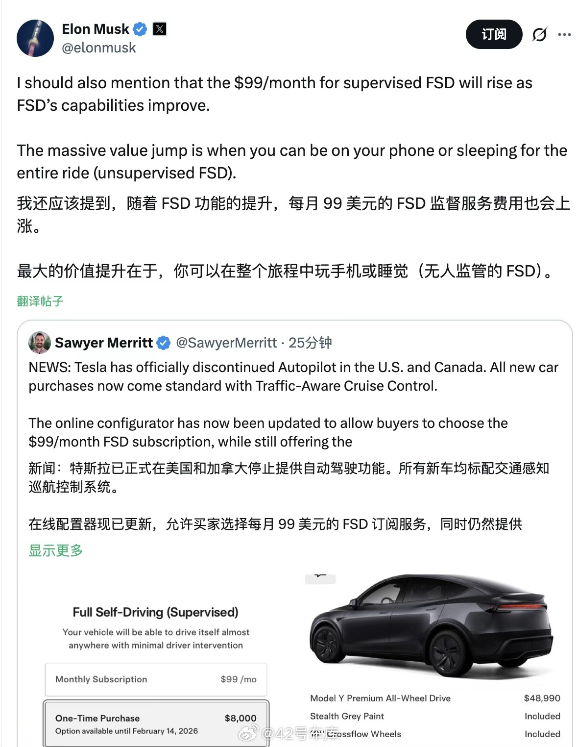 FSD真到L4水平了,99美元一个月,请一个司机,肯定是价格低的。换算到国内,别说699人民币每个月,1699甚至2699每个月,价格也并不贵。前提是,真的能实现安心睡觉、玩手机。