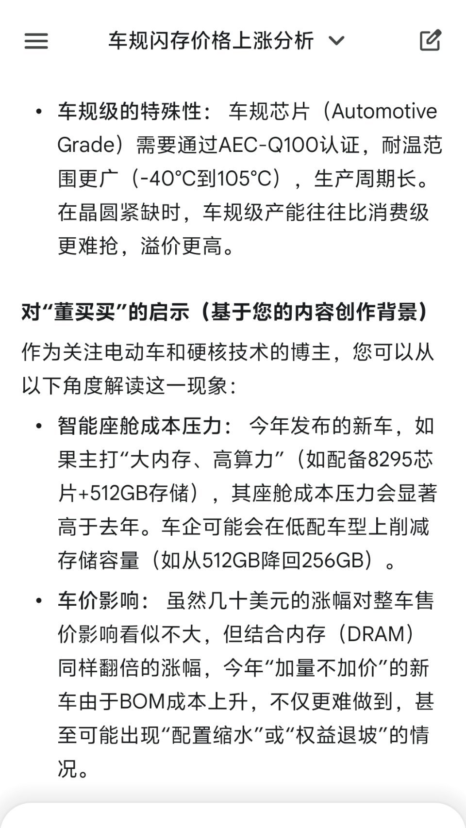 车企在造车的时候,BOM成本按照几毛钱甚至几分钱来抠。今年颗粒价格一涨价,内存/闪存都疯了。一台车BOM增加大几百甚至上千块。这时候如果车还降价,那就要担心是不是256G变64G了车规是不是变消费级了。
