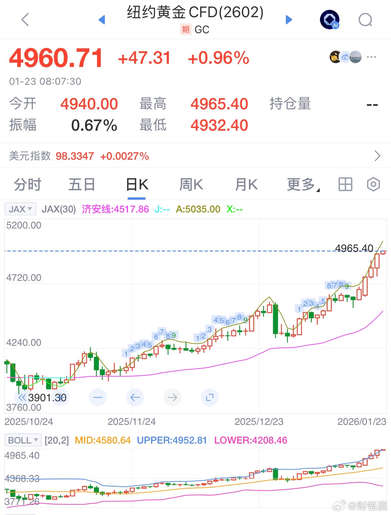 金价狂飙破4900 !俄乌三方会谈、特朗普“警告”搅动全球市场1月23日,全球市场风云突变,金价、银价大幅上涨,地缘政治与经济政策交织影响市场走向。贵金属市场方面,伦敦金现货价格收涨3.31%,突破4900美元/盎司大关,报4935.75美元/盎司;伦敦银现货价格大涨近6%。内盘化工品种夜盘亦集体上扬,合成橡胶期价涨停,20号胶、苯乙烯等期价涨近3%。地缘政治领域,俄乌局势出现新进展。乌克兰总统泽连斯基称,乌、美、俄三方会谈将于23日在阿联酋举行,持续两天。同时,美国总统特使威特科夫与特朗普女婿库什纳23日将与普京会晤,威特科夫表示俄乌和平进程已至最后阶段,他对结果保持乐观。此外,特朗普警告欧洲,若抛售美债等资产将面临大规模报复,还称推进中的格陵兰岛协议将赋予美国“一切想要的军事进入权”。谈及美伊关系,特朗普透露伊朗有意与美接触,双方或恢复外交沟通,但未说明具体细节。经济政策层面,土耳其央行宣布降息100个基点,政策利率降至37%,称2025年12月通胀潜在趋势下降,将持续紧缩货币政策以强化去通胀进程。然而,政策决定公布后,土耳其主要银行指数跌超2%。原油市场则传来利空,美国能源部长呼吁全球石油产量翻倍,国际油价应声下跌。国际能源署警告,除非发生重大供应中断,否则2026年第一季度全球原油市场将面临显著供应过剩。市场分析认为,目前原油市场多空因素交织,地缘局势、OPEC+产量政策及特朗普政府政策等将成为影响油价的关键变量。 黄金金价