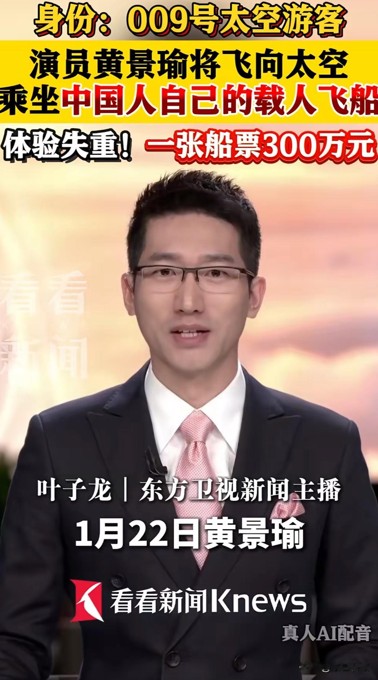 万万没想到,除了太空飞行员,咱们普通人也即将登上太空了! 演员黄景瑜将搭乘商用太空飞船前往太空,普通老百姓上太空终于不再是梦想! 1月22日,演员黄景瑜宣布将以009号太空游客的身份,成为中国首批商业航天太空游客。他将于2028年搭乘国产太空飞船飞赴亚轨道太空。届时,他将与中国工程院院士李立郢等人一同前往。 到时候,他们能在太空飞船里体验失重状态,还能俯瞰地球全景。 据悉,此次太空之旅单张船票300万人民币,大家觉得值不值? 欢迎评论区聊聊。 (图片来源网络)