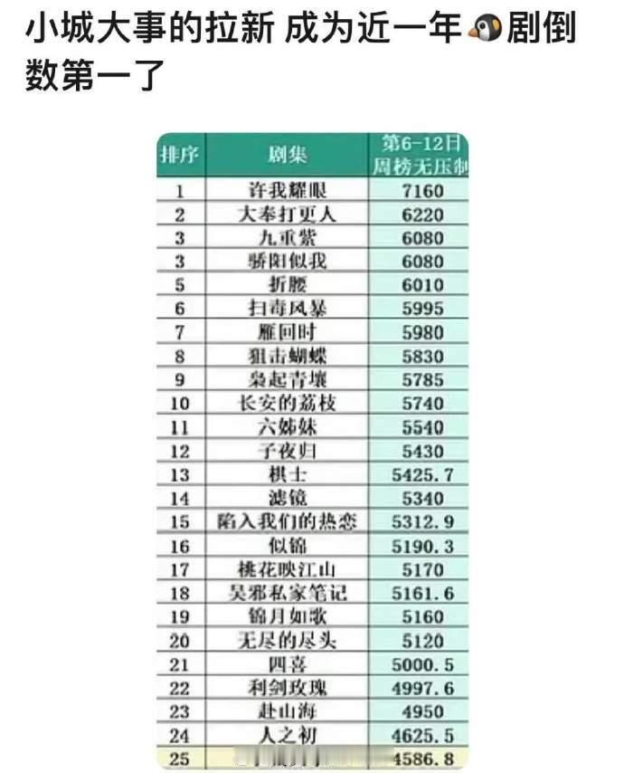小城大事拉新是🐧的倒数第一说好的扛剧花呢这部剧我只记住了晓明哥贡献的热梗里头门,颖火虫记得感谢下晓明哥