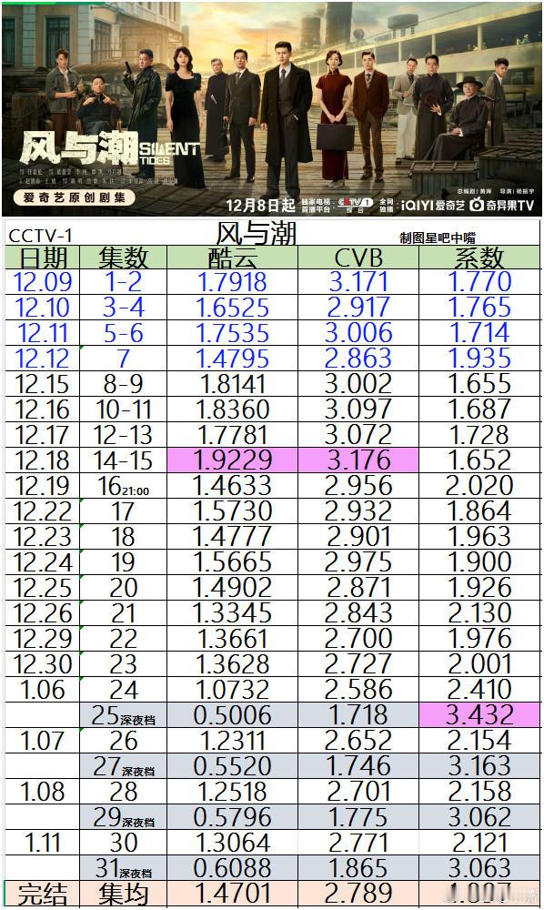 任嘉伦风与潮 《风与潮》央一收官战报,来看详细的分集收视日历。酷云集均:1.4701,暂列1/2CVB集均:2.789, 暂列1/222:30深夜档4集收视1.7-1.8。拉低平均了。