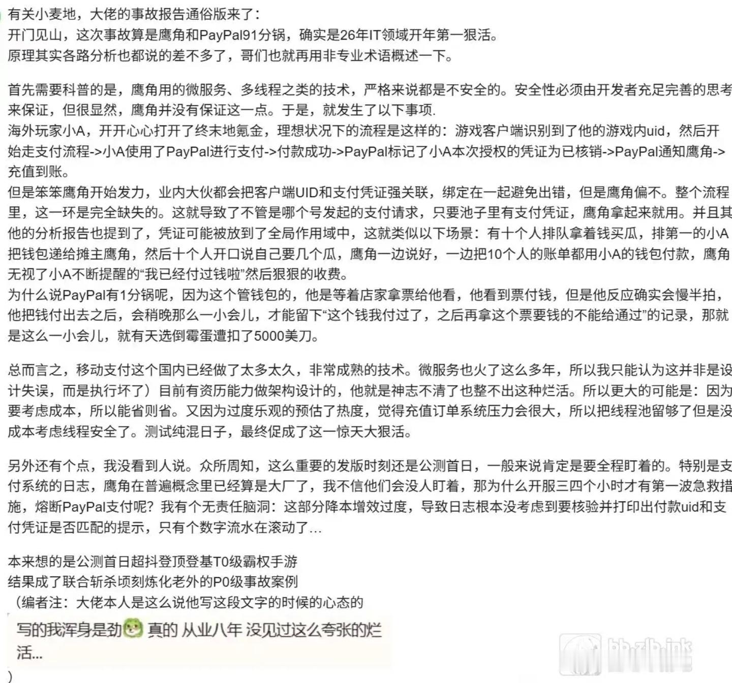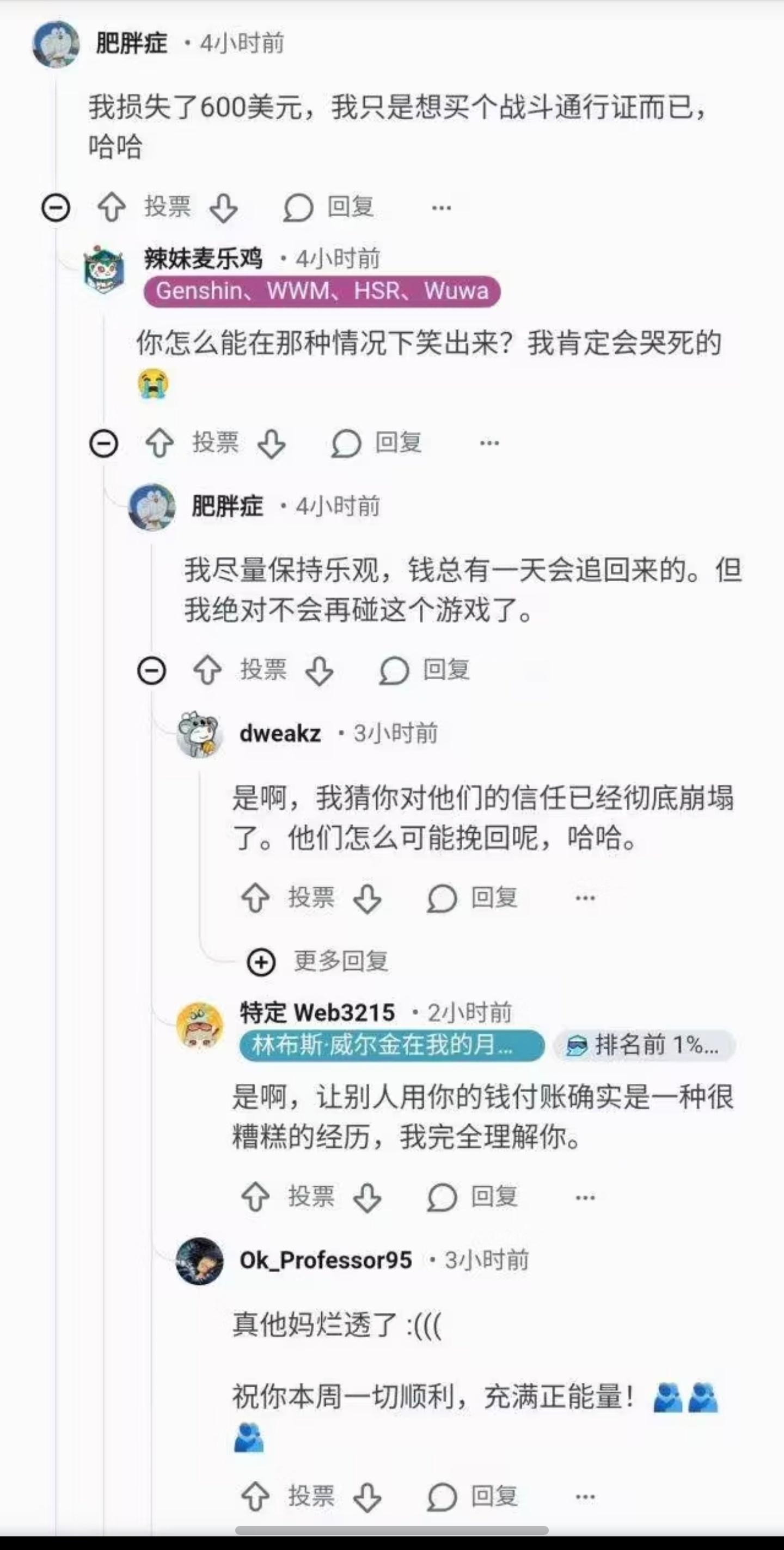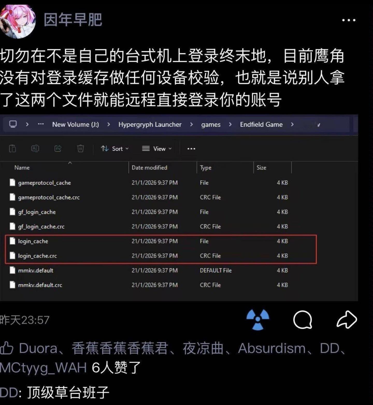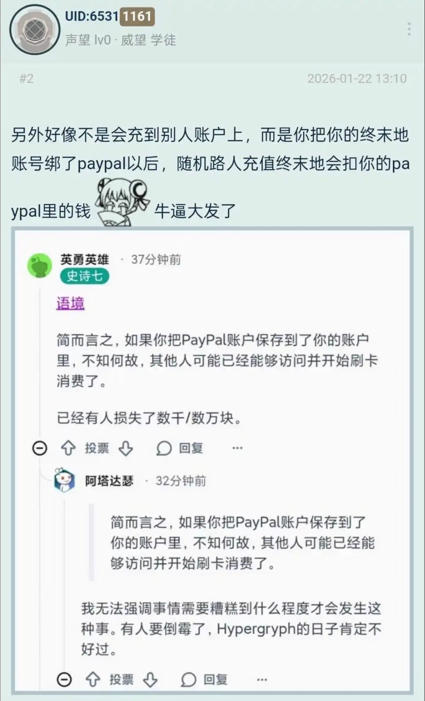 逆天大事故,终末地外服PayPal支付出错,造成玩家充值会扣另一个玩家的钱这个案子要是大起来还不知道怎么收场,毕竟老美和欧盟的讼棍太多了😂我还刷到个群友的BUG,说是PC端替换文件就能直接登录你的账号,逆天