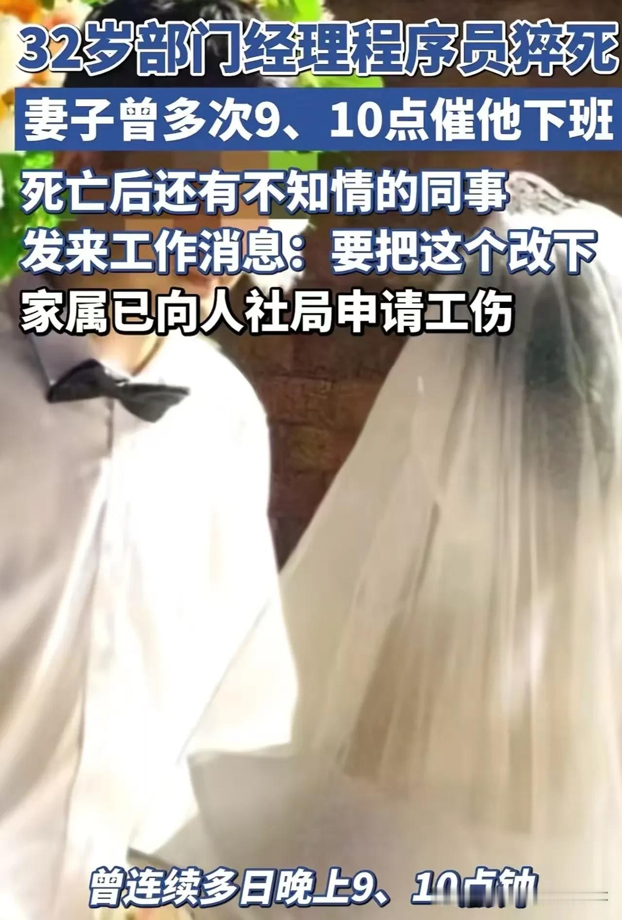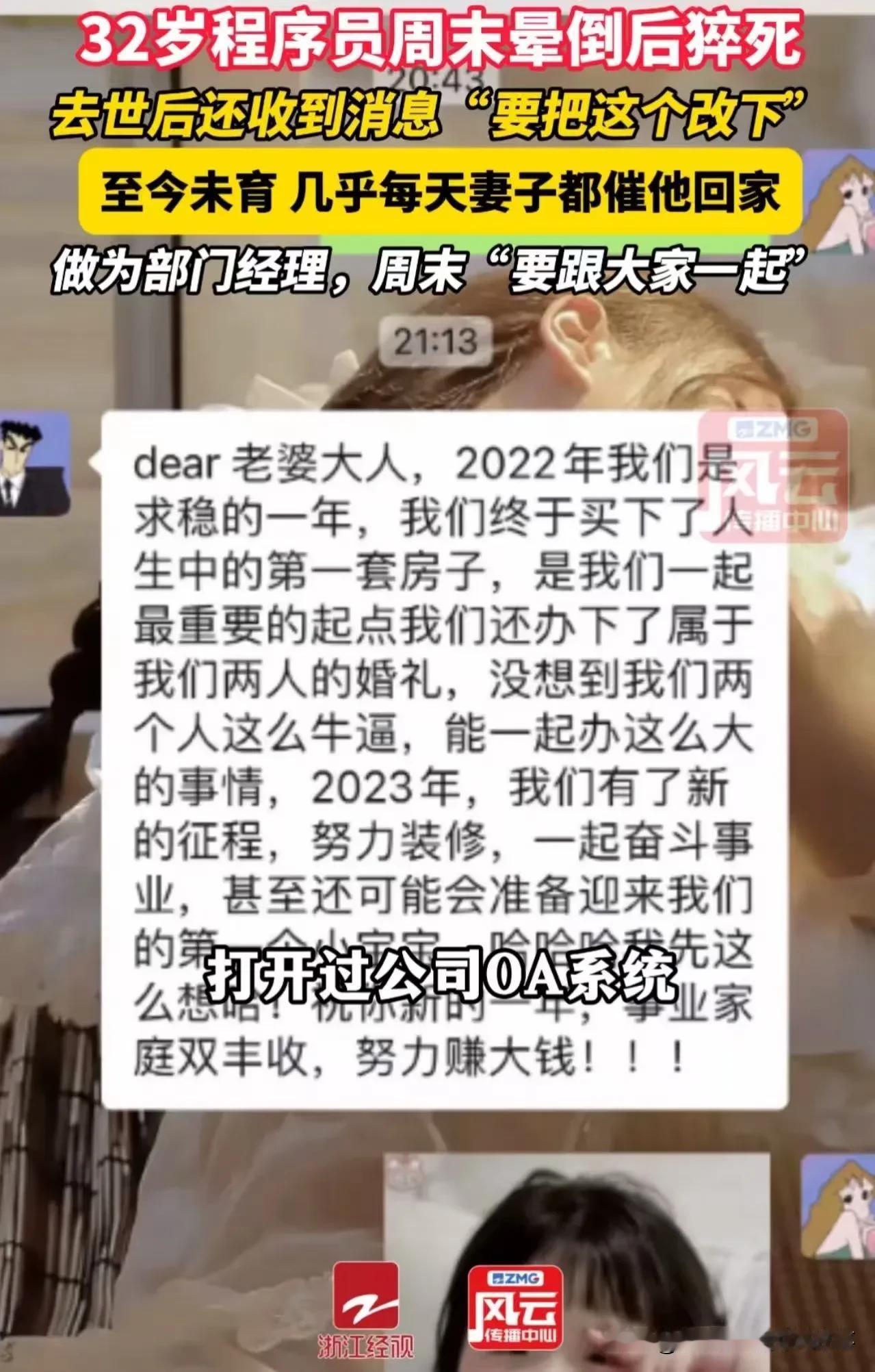 这则新闻看得心里又沉又堵,32岁的鲜活生命,倒在了无休止的加班里,身后是未圆的生娃心愿,是妻子撕心裂肺的遗憾,而离世8小时的催工消息,更像一根刺,扎得人喘不过气。 所谓的“急任务”,在生命面前轻如鸿毛,可有些职场里,总把员工的付出当作理所当然,把无休止的加班当成常态,却忘了每个打工人背后,都是一个盼着他平安回家的家。 愿这起悲剧能敲响警钟,愿职场多些人文关怀,少些无意义的内耗和加班,愿每个努力生活的打工人,都能被善待,都能有时间拥抱生活、陪伴家人,而不是用健康和生命,去换一份所谓的“业绩”。 也愿逝者安息,愿他的家人能得到应有的公道和慰藉。 素材来源于网络,侵权删除。