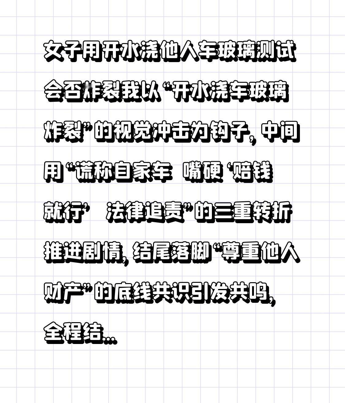 女子用开水浇他人车玻璃测试会否炸裂 我以“开水浇车玻璃炸裂”的视觉冲击为钩子,中间用“谎称自家车→嘴硬‘赔钱就行’→法律追责”的三重转折推进剧情,结尾落脚“尊重他人财产”的底线共识引发共鸣,全程结合真实事件细节与实用科普增强爆款属性。 家人们见过这么离谱的操作吗?安徽一女子为了拍视频博流量,竟然端着一壶开水,直接浇在别人停在路边的车玻璃上!就为了测试“冬天开水浇玻璃会不会炸”,下一秒“啪”的一声脆响,挡风玻璃瞬间裂成蜘蛛网,她却笑着说“大不了赔钱”?这到底是无知还是缺德? 咱们把这事儿扒得明明白白!1月21号,安徽淮南这位大姐穿着睡衣,对着手机镜头说得有模有样:“网上都说冬天开水浇玻璃会炸,我偏要试试!” 话音刚落,就把整壶冒着热气的开水,泼在了一辆陌生红色轿车的冰封挡风玻璃上。 本以为是“挑战谣言”,结果下一秒就翻车了——玻璃当场开裂,密密麻麻的裂纹看得人头皮发麻,大姐脸上的笑容瞬间凝固,赶紧关了视频溜之大吉。更气人的是,网友质疑她“为啥不用自己的车试”,她居然理直气壮回复:“自己的车心疼啊,别人的车赔点钱多大点事儿!” 得知原厂挡风玻璃换一块要2000多,也只轻飘飘说了句“这么贵”,全程没提道歉二字。 本以为只是自私缺德,没想到后续反转更劲爆!眼看骂声越来越大,大姐赶紧删了视频,把账号设为私密,还改口说“浇的是妹妹的车”,不是随机找的路人车辆。可网友早就截图留证,她视频主页明明标着“自家车辆”,转头就变卦,明摆着是心虚撒谎! 更关键的是,这根本不是“赔钱就能解决”的小事!律师直接点名:她的行为已经触碰法律红线!如果维修费用超过5000元,就涉嫌故意毁坏财物罪,可能面临刑事处罚;就算没到标准,也得承担民事赔偿,还可能被治安拘留罚款。而且冬天用开水浇冰玻璃,本身就是致命操作——玻璃温差超过80℃,远超承受极限,不仅会炸裂,融化的冰水流入车门缝隙还会再次结冰,甚至损伤密封胶条,留下安全隐患。 之前郑州就有车主这么干,玻璃裂了20厘米,花了1500元维修;沈阳车主更倒霉,玻璃碎了还烫伤手,损失超2000元。这位大姐倒好,拿别人的车当试验品,把别人的财产当博眼球的工具,简直把自私刻进了骨子里! 现在网友们都炸了:“这哪是测试,分明是故意毁车!”“赔钱就能抵消所有错?别人的车凭啥给你当道具?” 其实大家愤怒的不只是这一件事,而是生活中这种“漠视他人权益”的自私行为。 谁没遇到过类似的事?停在路边的车被刮了没人管,楼道里的东西被人随便挪动,总有人觉得“小事一桩”“赔钱就行”,却忘了最基本的尊重——别人的财产再不起眼,也不是你可以随意糟蹋的。换个角度想,要是有人拿你家东西做这种无聊实验,事后只说“我赔钱”,你能接受吗?做人的底线,就是不把自己的快乐建立在别人的损失上。 目前涉事女子的账号已经私密,但车主还没找到,律师也明确表示,就算是“妹妹的车”,未经同意也涉嫌侵犯财产权,必须承担赔偿责任。这件事也给大家提了个醒:冬天车玻璃结冰,千万别用开水浇!正确做法是用温水慢慢融化,或者用专用除冰剂、塑料刮片,既安全又不伤车。 更重要的是,我们要守住做人的底线——尊重他人的财产,就像尊重自己的一样。别为了一点流量就突破道德和法律的边界,一时的博眼球,可能要付出沉重的代价。毕竟,钱能赔偿损失,却买不回做人的体面和良知。 你觉得这位女子该被严惩吗?你遇到过类似的自私行为吗?评论区说出你的看法,点赞关注,一起抵制这种缺德操作,也给更多人提个醒,守住做人的底线!
