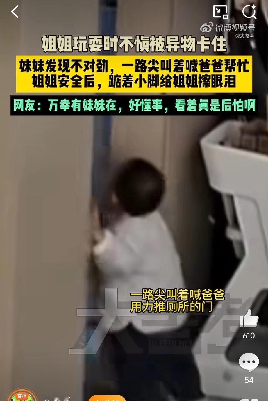 看得让人紧张, 没有这个妹妹,姐姐就要没命了! 浙江一家姐妹俩在房间玩,姐姐突然被吃的东西卡住了,一岁一个月的妹妹看着情况不对, 一路尖叫跑到厕所里,把蹲坑的爸爸拉过来,爸爸赶忙用海姆立克法救了姐姐。 才一岁的小孩子,能这么机灵知道喊大人,真是上天派来得小天使。 不过是不是所有的爸爸都这样,在家就住在厕所里!