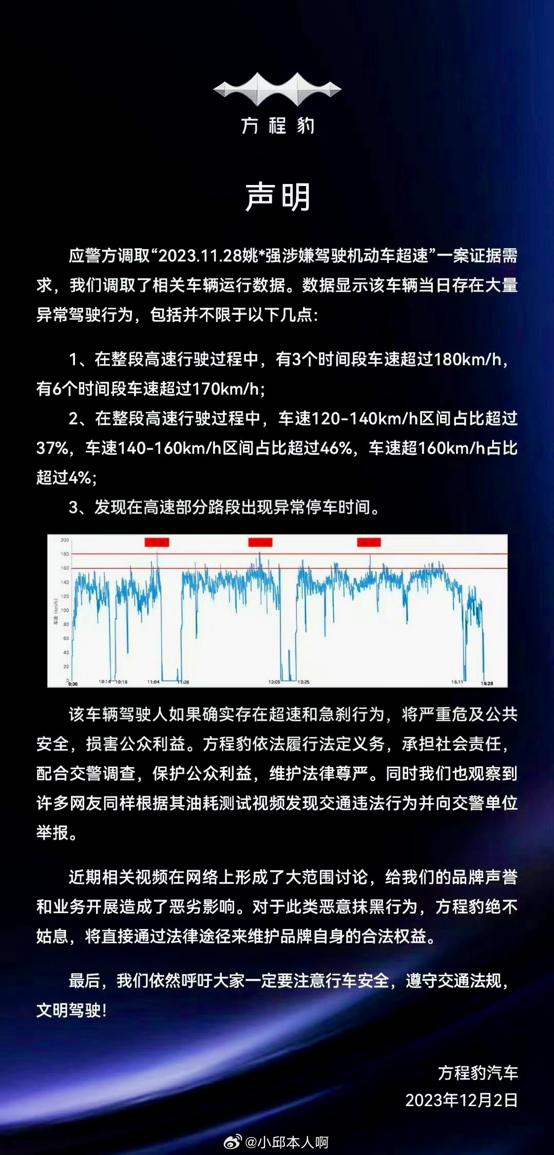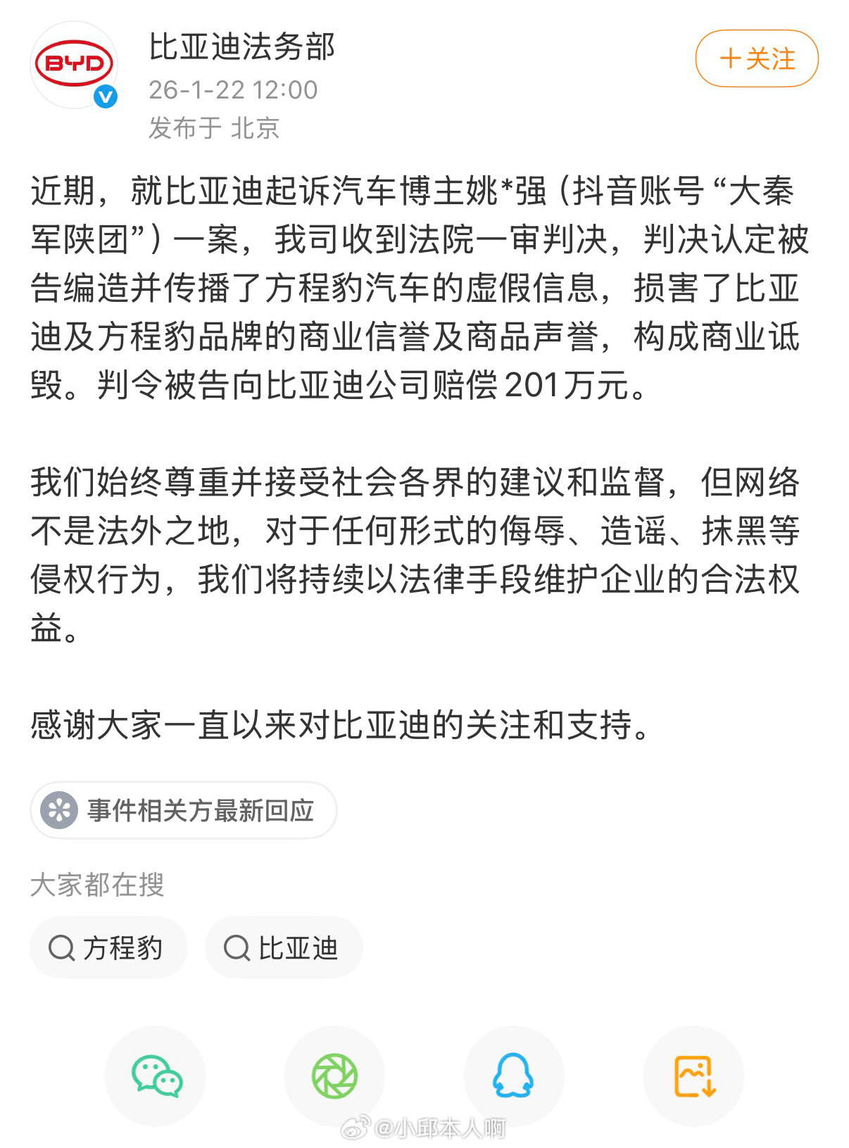 该来的终究来了!继“龙猪”“龙哥讲电车”“王悟空说车”之后,轮到“姚十八”了!2026年第一大好消息,比亚迪法务部正式公告:法院一审判决认定,抖音博主姚*强(大秦军,人称“姚十八”)编造并传播关于方程豹豹5的虚假信息,构成商业诋毁,判赔201万元。回看2023年底那场闹剧,他声称以“正常驾驶”测出豹5油耗高达18L/100km,引发全网质疑。可后台数据揭穿了一切:1、 多次飙车超180km/h2、 高速路段近半数时速在140–160km/h之间3、 空调开到最热,途中还开窗4、 本人驾照早已扣满12分,且身兼某车企职务这哪是测评?分明是用极端操作制造黑料!而比亚迪这次没手软,直接拿起法律武器。从“龙猪”到“王悟空说车”,再到如今的“姚十八”,一连串百万级赔偿案,正在为车圈划下清晰红线:你可以批评,但不能造谣,你有权监督,但别越界抹黑。更打脸的是,豹5非但没被黑垮,反而拿下2025年硬派越野销量冠军,还创下混动车最高海拔吉尼斯纪录(5980.05米)实力,永远是最好的回应。正如李云飞所说:我们接受监督,但对黑公关,绝不姑息!下一个已经在路上了。方程豹胜诉姚十八
