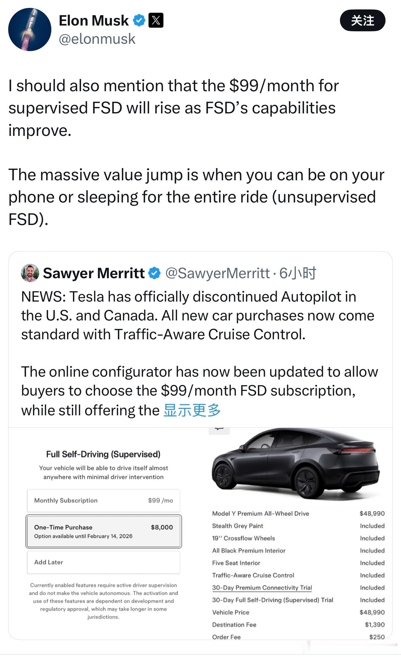 马斯克称,随着FSD的能力提升,未来每月99美元的月租费用还可能继续涨价特斯拉FSD最早2月有望在华获批 ,大家觉得国内用户有希望在2月14日结束买断之前用上吗