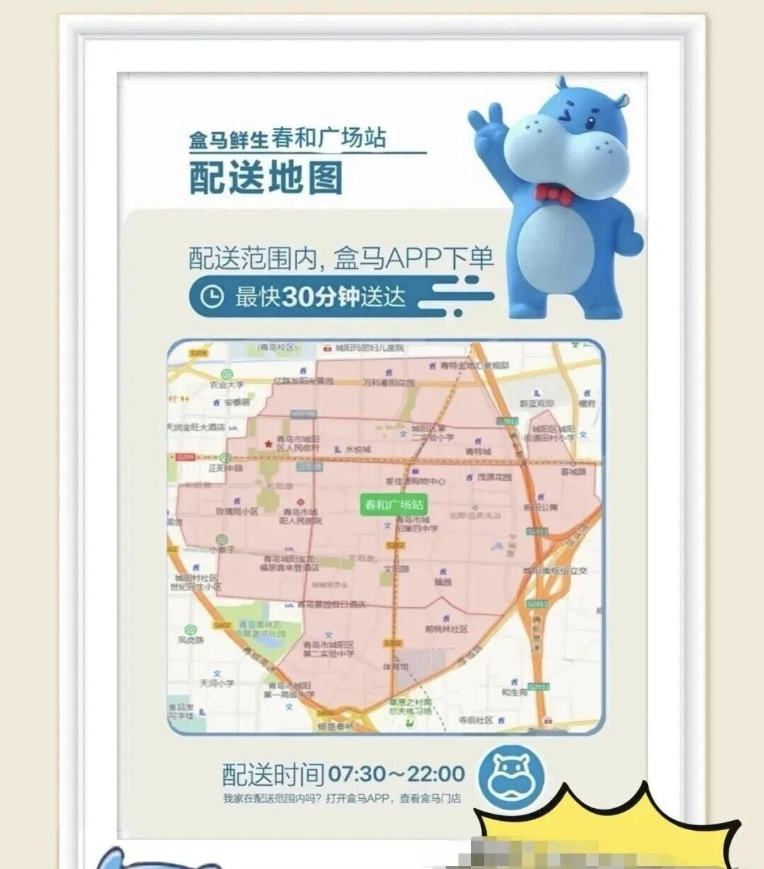 今天上午10点,青岛市城阳区万象汇B1层盒马线下快闪店正式开业配送!配送范围集中在城阳街道,最快30分钟配送到家,配送时间是早上七点半到晚上十点。