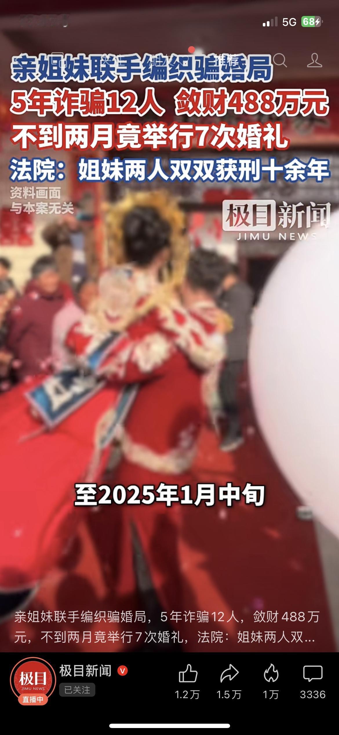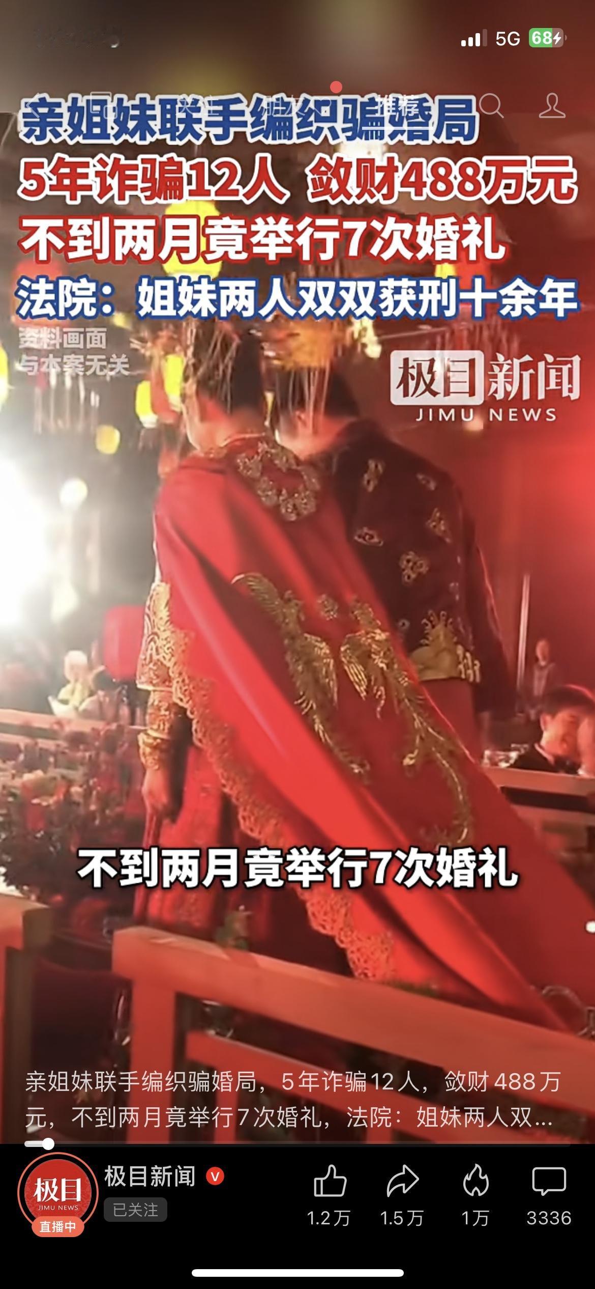 离谱!亲姐妹把结婚当提款机,5年骗婚12人狂敛488万!两人专挑单身男性下手,以谈婚论嫁为幌子骗取彩礼、礼金,最夸张的是2个月内办了7次婚礼,把受害者耍得团团转。最终东窗事发,姐妹俩都被法院判处十余年有期徒刑,好好的喜事愣是变成诈骗骗局!你身边遇过这类婚恋骗局吗?该怎么防范才靠谱?民生热点 法律科普婚姻骗婚