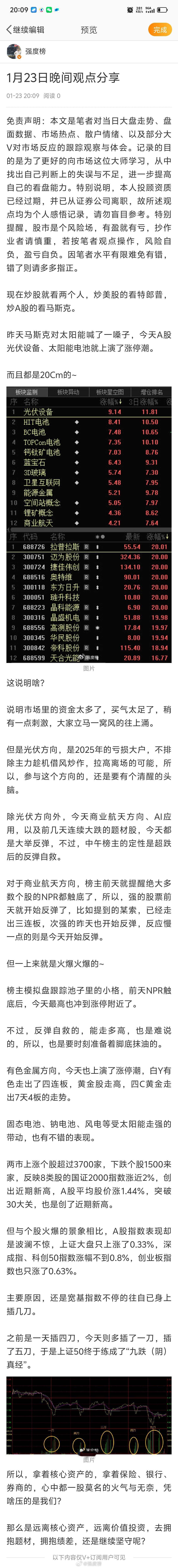 晚间分享 A股[超话] 1月23日晚间观点分享现在炒股就看两个人,炒美股的看特郎普,炒A股的看马斯克。昨天马斯克对太阳能喊了一嗓子,今天A股光伏设备、太阳能电池就上演了涨停潮。而且都是20Cm的~这说明啥?