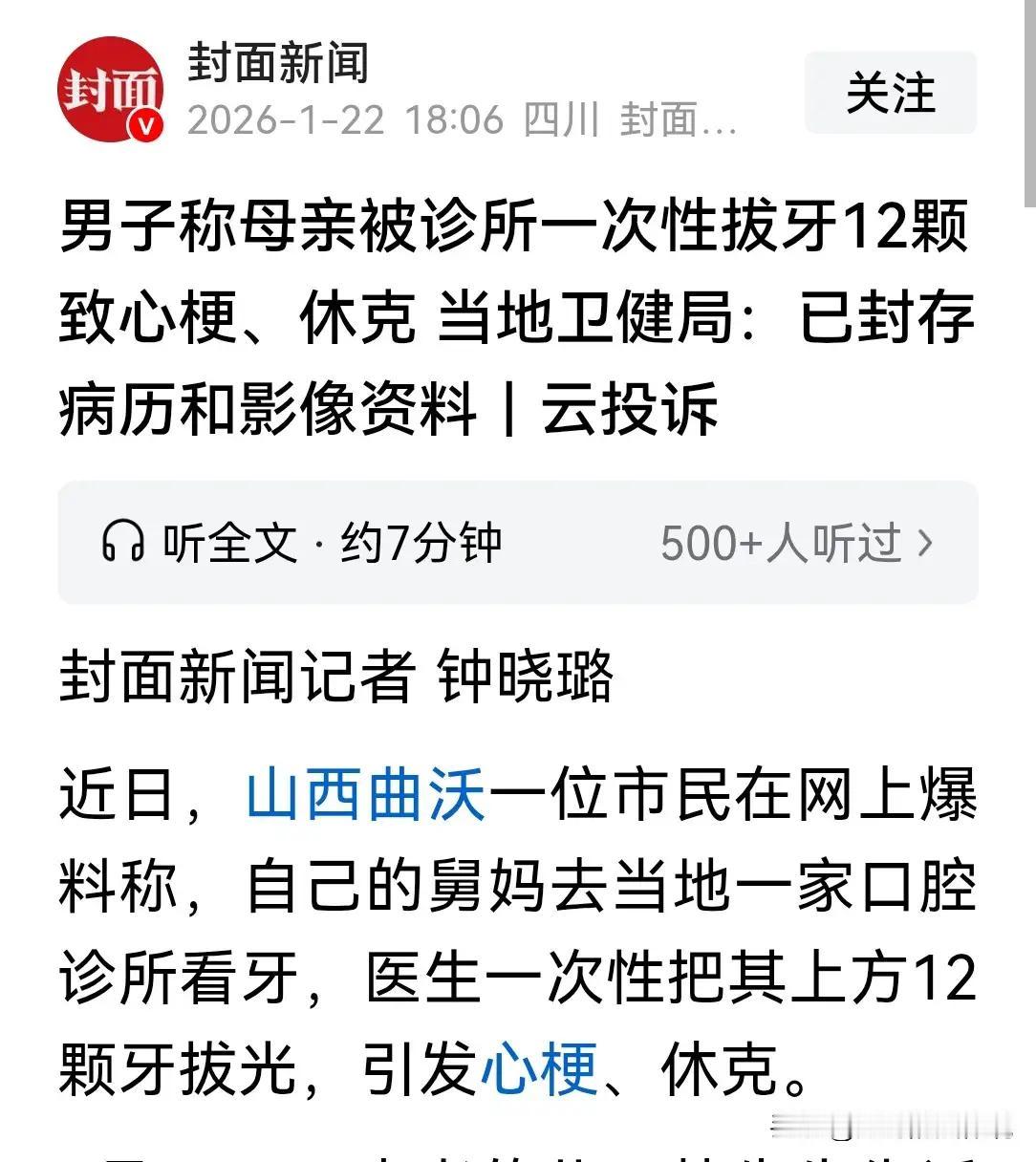 山西曲沃:一场生命的警钟,一次健康的深思 在山西曲沃的一个普通清晨,53岁的李阿姨怀揣着对健康的渴望走进了一家口腔诊所。她只是想修补那颗“老掉牙”的牙齿,谁曾想,这次看牙竟变成了一场生死搏斗。医生说拔三颗牙,结果拔掉了十二颗,瞬间如同“天降横祸”,让李阿姨的下巴“脱缰而去”,人也陷入了危机四伏的深渊。 家属焦急万分,拨打急救电话,奔波于县医院和更高级别的医院之间。经过紧急抢救,李阿姨被诊断为心梗休克,血流如注,五六袋血如洪水猛兽般灌入体内,生命的火苗才得以延续。经过20多天的奋战,她终于捡回一条命,但代价却是“身心俱疲”,全天依赖护理,犹如“行走的生命之舟”。 令人扼腕的是,事发后,那家诊所不仅没有一句关心问候,更是冷漠以待,让人心如死灰。此事犹如一记警钟,敲响了我们对“健康第一”的深刻认识。真正的健康,不仅仅是外在的“光鲜亮丽”,更是内外双调的和谐共鸣——身心健康,才能“天人合一”。 “勿以善小而不为,勿以恶小而为之。”每一个微小的健康细节都关系到生命的质量。我们要学会“未雨绸缪”,加强健康意识,重视日常的营养、运动和心理调适。只有“身心两健”,才能“百病不侵”,迎接生活的每一次挑战。 感恩之心,是生命中最亮的灯塔。感恩医者的辛勤付出,感恩家人的无私守护,更要感恩自己对健康的珍惜与呵护。健康是一场“持久战”,需要我们用“坚持不懈”的精神,去守护那份来之不易的生命之光。 让我们以李阿姨的故事为鉴,铭记“生命至上,健康第一”的信条。只有心怀感恩,懂得珍惜,才能在风雨中稳步前行,迎来属于我们的“春暖花开”。健康,正是我们最大的财富,也是我们最值得守护的幸福源泉!