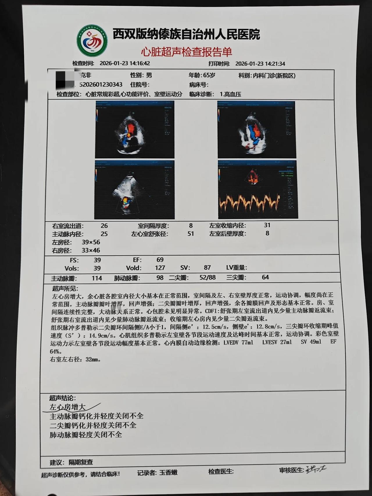 我是昨天晚上才果断做出今天去西双版纳景州医院做心脏彩超的决定的。 昨天晚上腋下靠心脏部位隐隐作痛。两个多月浑身无力。 刘妈有点着急上火了,要打120 ,我说不用,没有那么严重。 孩子在黑龙江远程给挂的号,我是这么想的,万一检查结果不好,马上就去昆明,老家东北不能回去,一个是路途遥远,还有就是天气太冷了。 第二选择是飞杭州去湖州找我兄弟去,第三是飞广州去广州中山医学院。 我没有过高的要求,再让我活五年就行。有五年时间这辈子好多想理顺的事儿,时间也绰绰有余了。 但是,你要是说现在就消失了,有点凌乱不堪。 我这辈子没怎么去过医院,心脏就是例行体检做过几次心电图。 医界的好几个友人 ,听了我的状况,说,你就做一个心脏彩超就行,没有大问题,你就挨到开春 再去大城市系统检查一下。意思是说,西双版纳景洪医疗条件还是不行。 刘妈跑前跑后,交款,心脏彩超是258块,我医保用不了,是自费。这钱也是刘妈拿的。 反正这几年,大钱小钱互相从来没有计较过。 躺着做彩超的时候,兄弟于老二两口子突然出现在门口。说,担心有啥大事儿。所以,知道了就过来了。 检查结果就是图片这个样子,网友诸君有会看得的,麻烦帮我看看。 大体上好像没有大事,但是,心脏冠状动脉堵不堵,堵到什么程度,做彩超看不出来。 从医院回来,兄弟于老二说什么要情我们吃饭。说,我带过来一斤酒,让我喝点试试。 刘妈在酒桌子上说,这两天看我心脏难受,她想了好多,说万一我不行了,就把我带回去埋鹤岗去。 我说鹤岗太冷了,西双版纳虫子又多,埋营口鲅鱼圈吧。刘妈不同意。