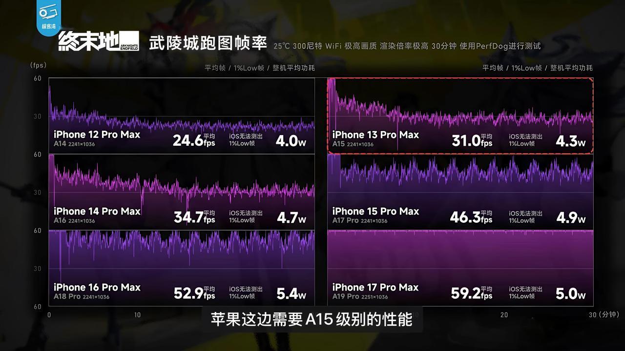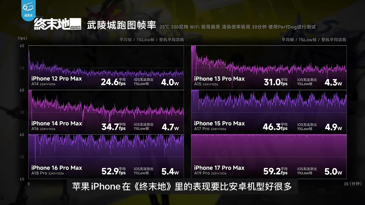 凭跑分论苹果性能不行的才是真的招笑! 最近几年高通芯片基本都针对跑分进行特定优化,让跑分尽量好看。所以很多人说骁龙8Elite Gen5比A19 Pro强很多。 但事实证明苹果芯片在移动端还是太超前了。 众所周知苹果在CPU方面从A11至今一直维持双强P核+四高能效E核的设计。 而今天,诸如终末地等此类二游不仅对GPU性能有极高要求,还要求CPU有双强P核。早年的处理器有且只有一个幸存的例外,那就是A17 Pro。因为双强p核+不俗的snl性能+桌面端gpu特性在早年有且只有A17 Pro拥有。 想当年安卓阵营是怎么嘲讽苹果的。现在再看呢?苹果依然延续双强p核优势,在gpu上更是突飞猛进,Apple10带来强悍的光栅与光追性能,每个gpu核心都拥有神经网络加速器,全场只有17pro系列支持手机端光追,17promax用5w的功耗稳住了一条直线的60帧...而且机身不怎么发热[吐舌]