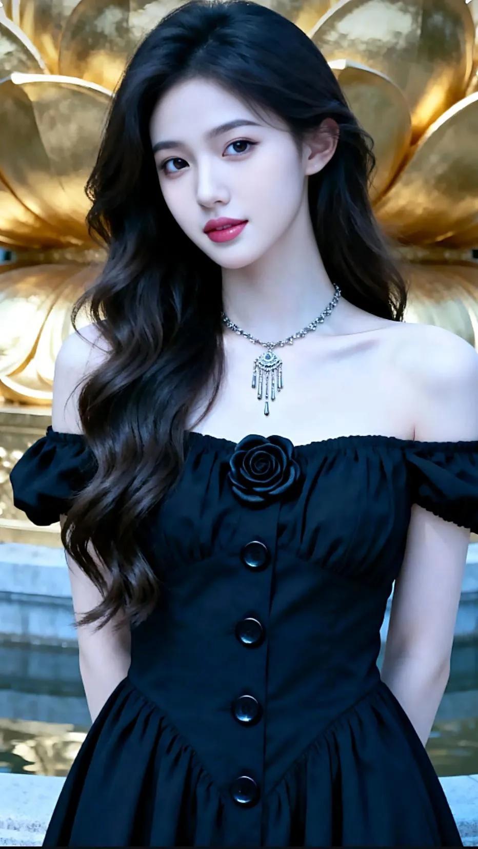 黑白色调旗袍,搭配绿宝石耳环,红艳背景花海,尽显东方韵味!