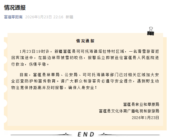 【#官方通报可可托海雪豹咬伤游客# 】1月23日19时许,新疆富蕴县可可托海镇塔拉特村区域,一名滑雪游客返回宾馆途中,在路边林带被雪豹咬伤,报警后立即被送往富蕴县人民医院进行救治,伤情平稳。目前,富蕴县林草局、公安局、可可托海镇等部门已对相关区域加大安全巡查防护和宣传教育。请广大群众和游客务必遵守安全提示,遇到野生动物注意保持距离并及时报警,确保人身安全!