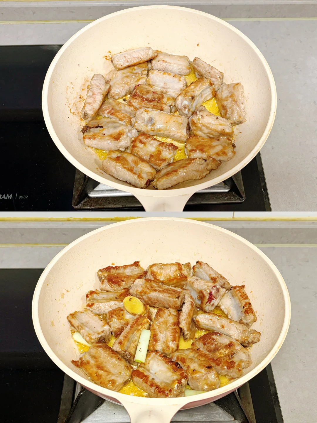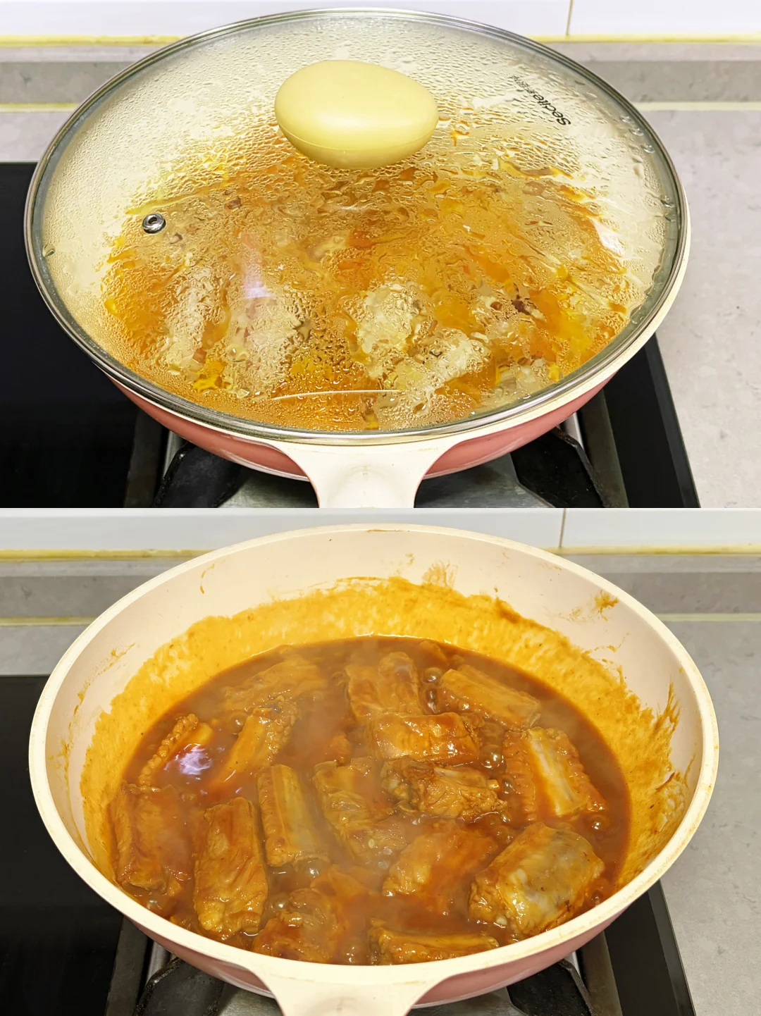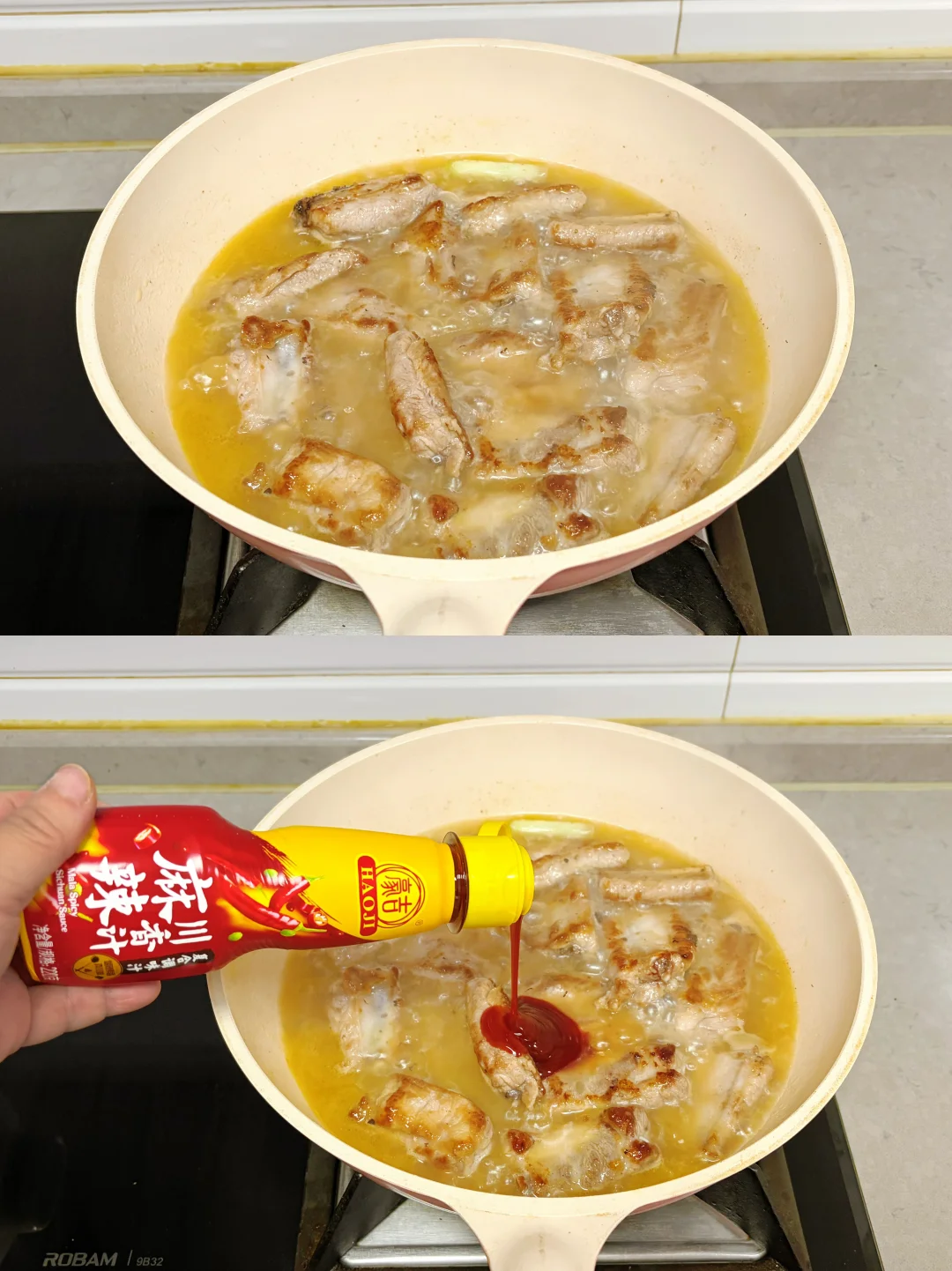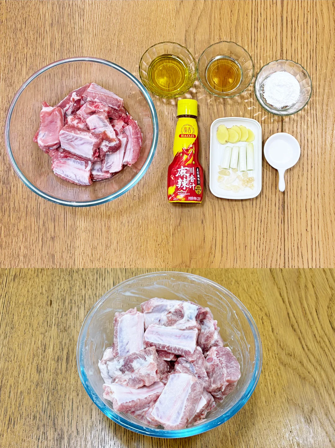 在七碟八碗的年饭桌上,红烧排骨总也吃不腻。但吃了许多年的北方传统味,难免有些口味疲劳,却又担心贸然改变口味,浪费了食材,坏了心情。老公走南闯北经常出差,尤其对川渝美食大加赞美,兴致高涨时抄起家伙就做了一道红烧麻辣排骨。还别说,真香!不光排骨立马儿瓜分了,连汤都拌着饭吃光了。此后,红烧麻辣排骨几乎成了老公的招牌菜。但毕竟只是吃过川菜却未得精髓,所以只能“照猫画虎”,味道极不稳定。老公信心满满,说再练几次,早晚能吃上正宗味儿。 自从发现了豪吉麻辣川香汁,老公秒变川菜大师,不光排骨做得好,就连炖菜、炒菜、凉拌菜都好吃得不像话!豪吉麻辣川香汁是由川菜大师匠心秘制的,经典复合的川式麻辣鲜香风味,用它调味根本不用担心失手。即使无油也能烹出好味道,0防腐剂更让人放心食用。自从豪吉麻辣川香汁进我家,就好像把川菜馆也搬来了。老公说:“我终于可以出师了!”那就和我一起看看我家大师傅是如何做出这道 “上桌一抢光”的红烧麻辣排骨吧! 原料: 新鲜排骨800克,植物油30克,鲜姜10克,大葱15克,冰糖10克,盐1克,玉米淀粉10克,豪吉麻辣川香汁30克,料酒10克,生抽10克,老抽3克,开水800克 做法: 1️⃣准备食材:排骨、姜片、大葱段、冰糖、盐、玉米淀粉、料酒、豪吉麻辣川香汁; 2️⃣排骨用凉水浸泡10分钟,捞出攥掉多余水分,加1克盐、10克玉米淀粉,10克料酒,拌匀腌制10分钟; 3️⃣平底锅中倒入30克植物油,油温4、5成热时放入排骨,小火煎至两面金黄; 4️⃣放入10克冰糖,10克姜片,15克大葱段,煸炒至冰糖融化; 5️⃣锅中倒入800克开水; 6️⃣倒入30克豪吉麻辣川香汁; 7️⃣盖盖,小火焖炖30分钟; 8️⃣打开锅盖,淋入10克生抽,3克老抽,中火收汁到满意程度,出锅; 9️⃣红烧麻辣排骨,麻辣鲜香,一汁到味,仿佛把川菜大师请到了家,太正宗了。 小贴士: 1️⃣新鲜排骨无需焯水,冻排骨需解冻后焯水去腥再烹制; 2️⃣豪吉麻辣川香汁可根据个人口味调整用量,喜欢浓香的可放些,喜欢味淡的少放些; 3️⃣一定要倒入开水,用凉水会使肉质紧缩,口感干硬。