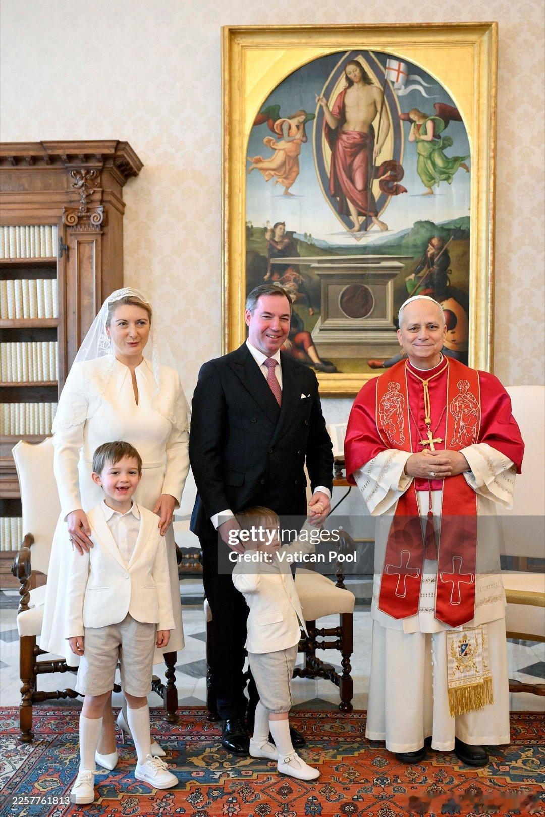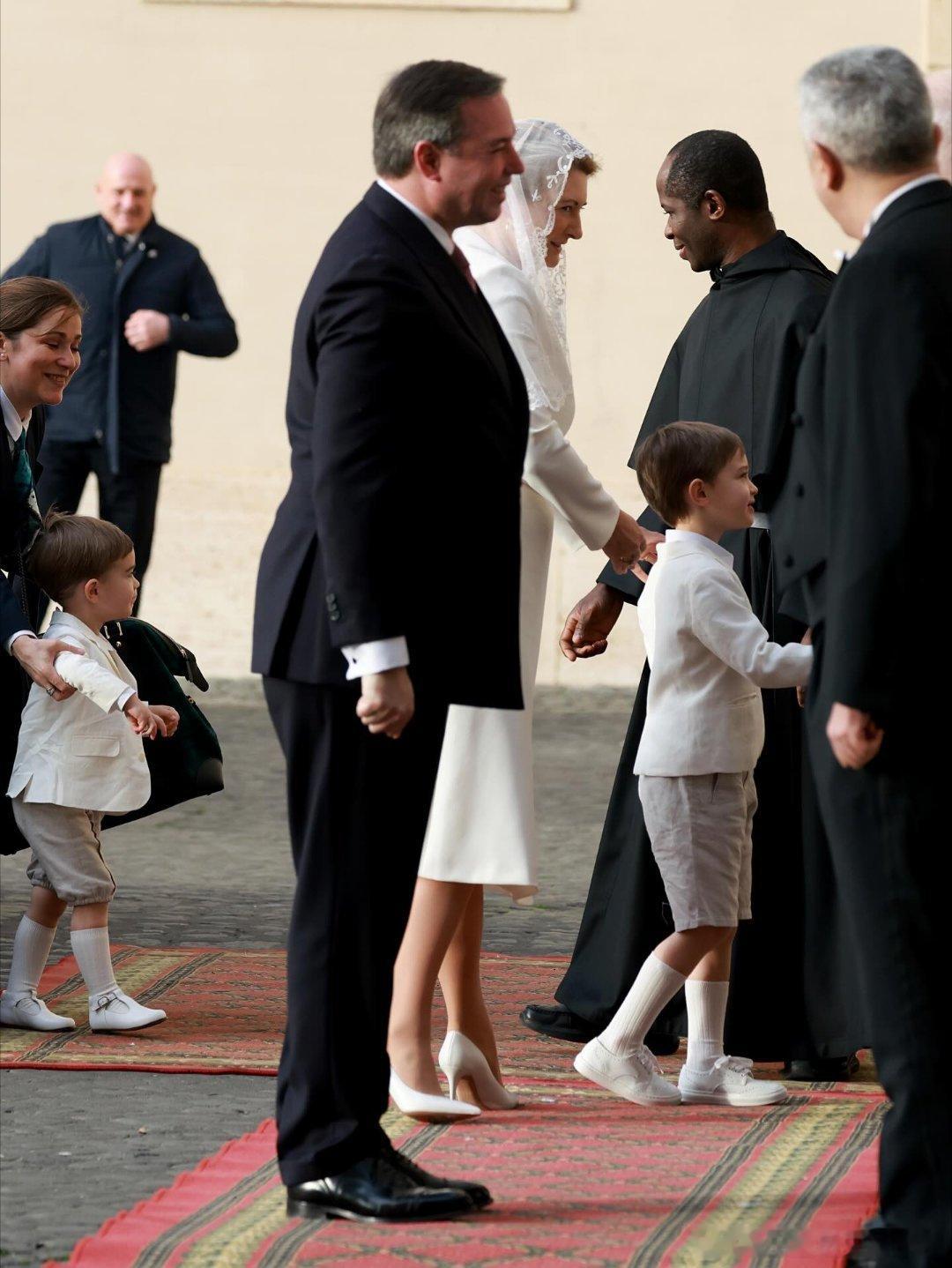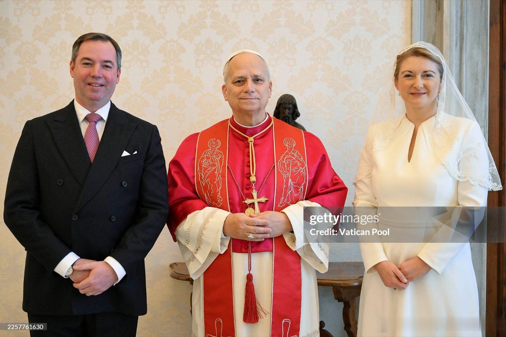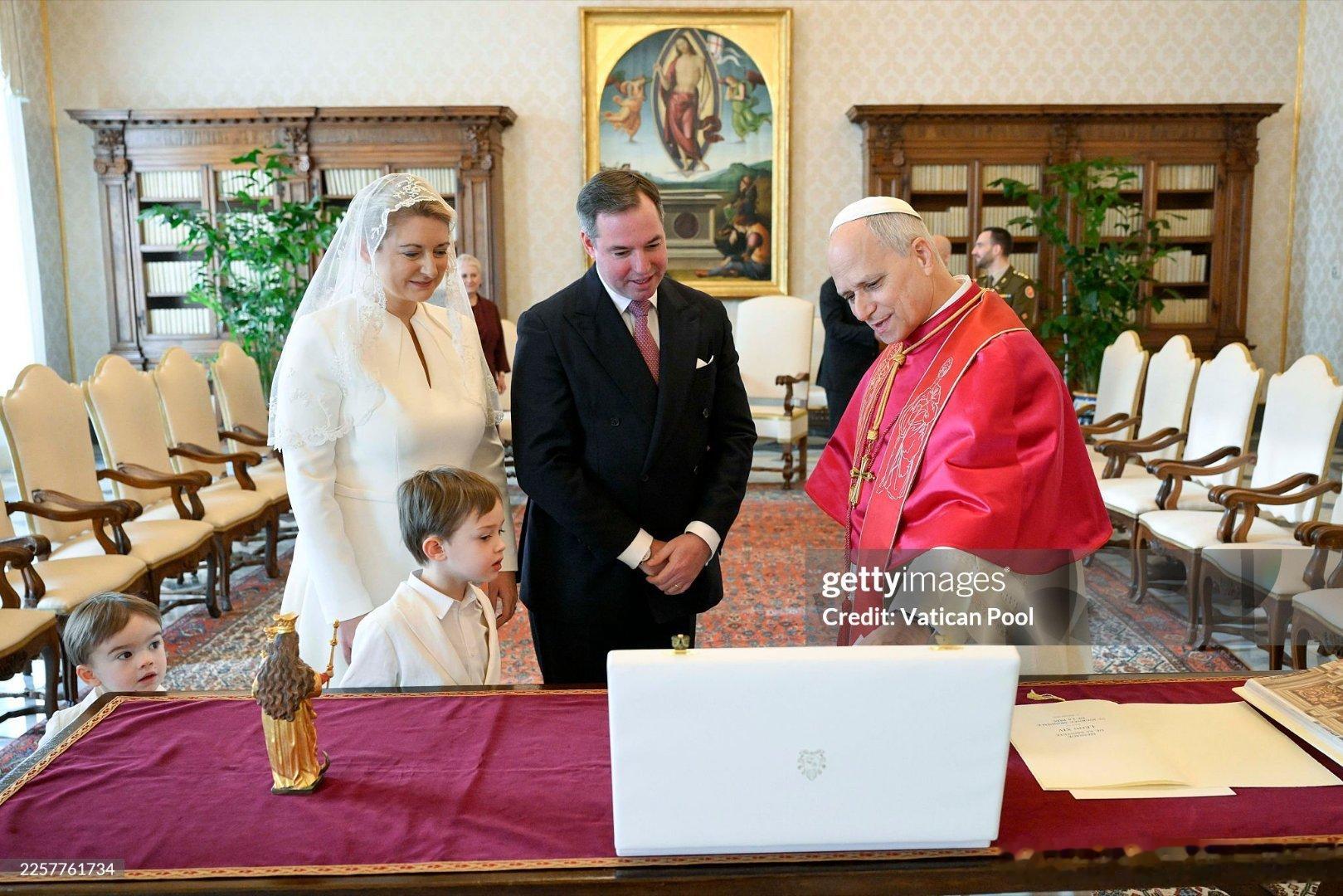 新闻 2026.1.23 卢森堡大公一家访问梵蒂冈并觐见教皇利奥十四世,这是卢森堡大公纪尧姆五世即位后首次访问梵蒂冈,斯蒂芬妮第一次穿白衣觐见(见教皇的穿衣规则:网页链接)。PS:斯蒂芬妮上哪扯的蚊帐当白纱呦。